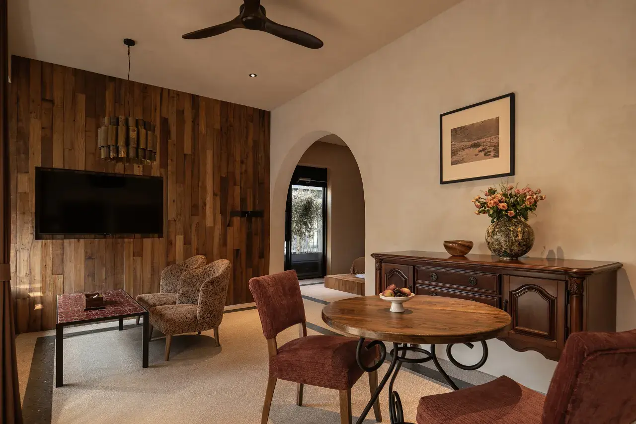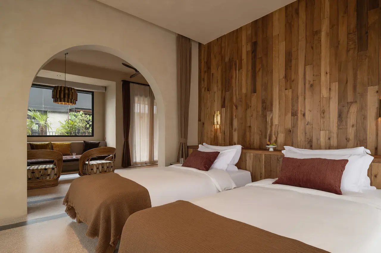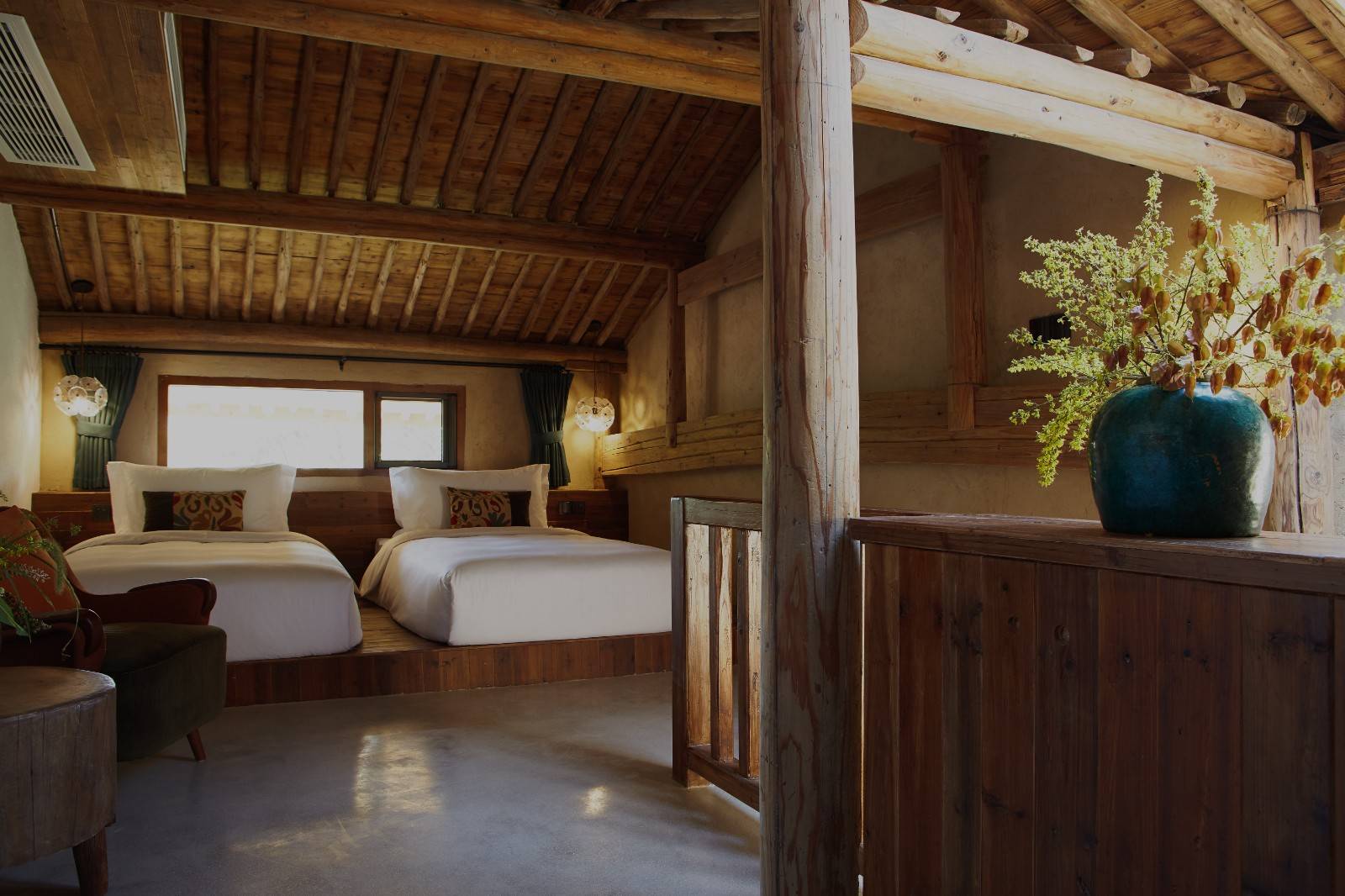 麻雀虽小五脏俱全,西坡·江山也是如此。虽然民宿整体体量不大,每间房45㎡起跳,配置还是一如既往的齐全。房间的装饰采用的是世界各地的老物件。本次入住的是复式经典大/双床房。