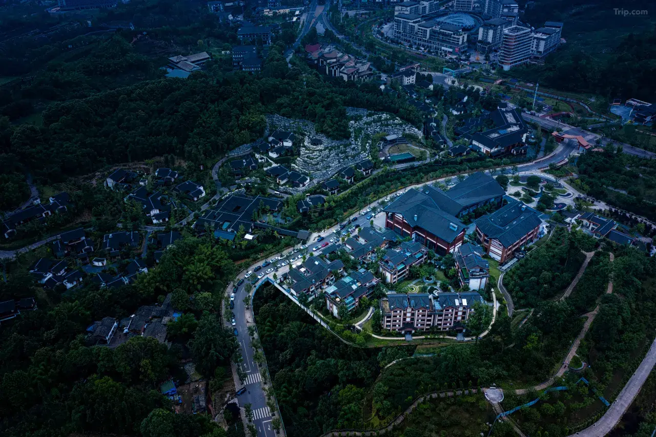 左伴世界灌溉工程遗产——“天府之源”都江堰;右临世界文化遗产地——“道教圣地”青城山脉;背靠世界自然遗产——国宝之家“熊猫谷”以及财神山“赵公山”,面朝长江支流“岷江流域”,黑石河从酒店群之间穿流而过,倚山傍水,自然环境得天独厚。