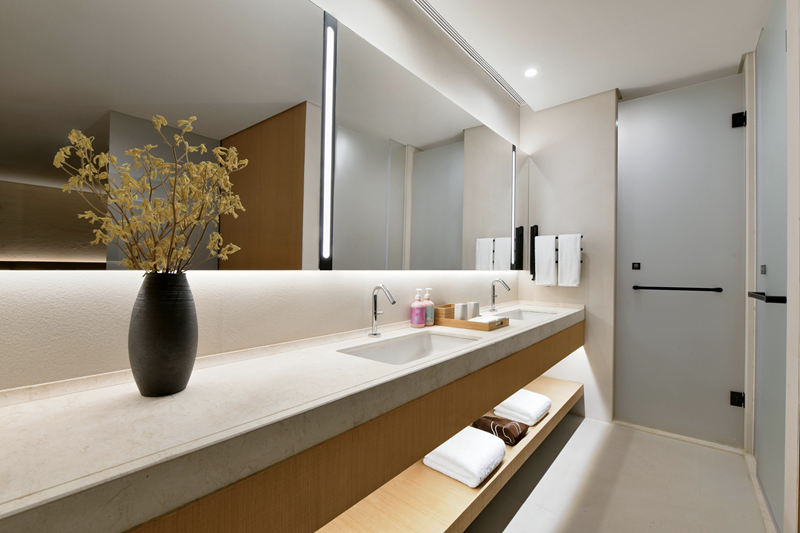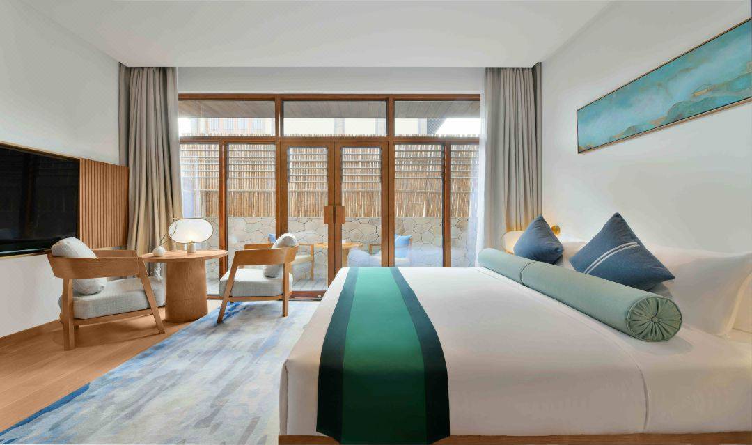 酒店整体采用简欧现代风格结合海洋元素,凸显海洋主题,装饰品及艺术品中加入更多的珊瑚、海浪等元素,营造轻松、简洁、明快的氛围。