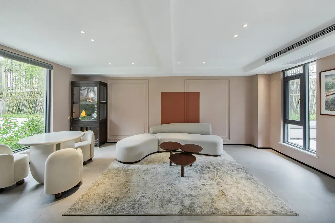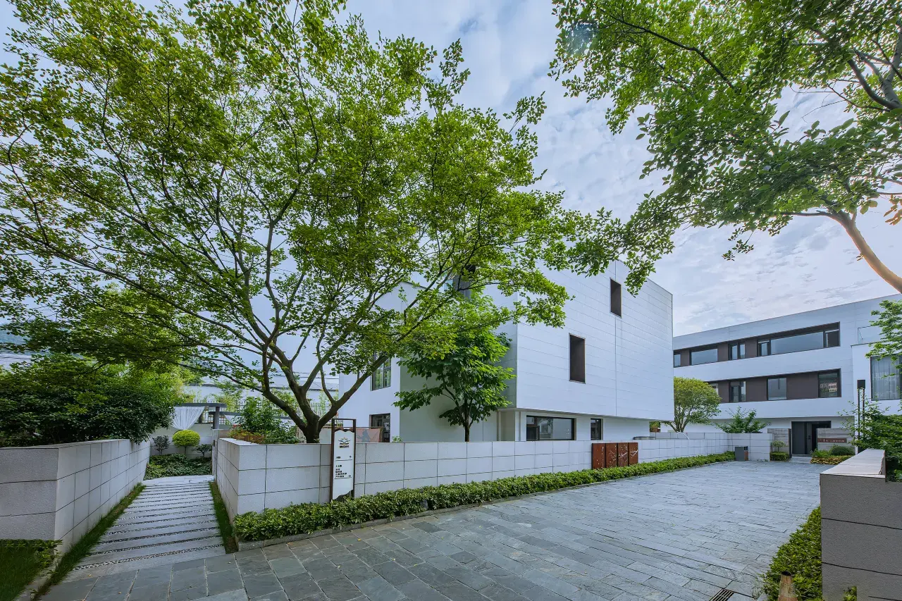 从远处走近,白色建筑与优雅自然环境的完美结合,纯净简洁而充满高级感。门庭的枯山水、到庭院的园林景观,流水、奇石、秀树,辅以花、果、叶的颜色和香味,移步换景,水石相映,增加了漫自然的山林野趣。