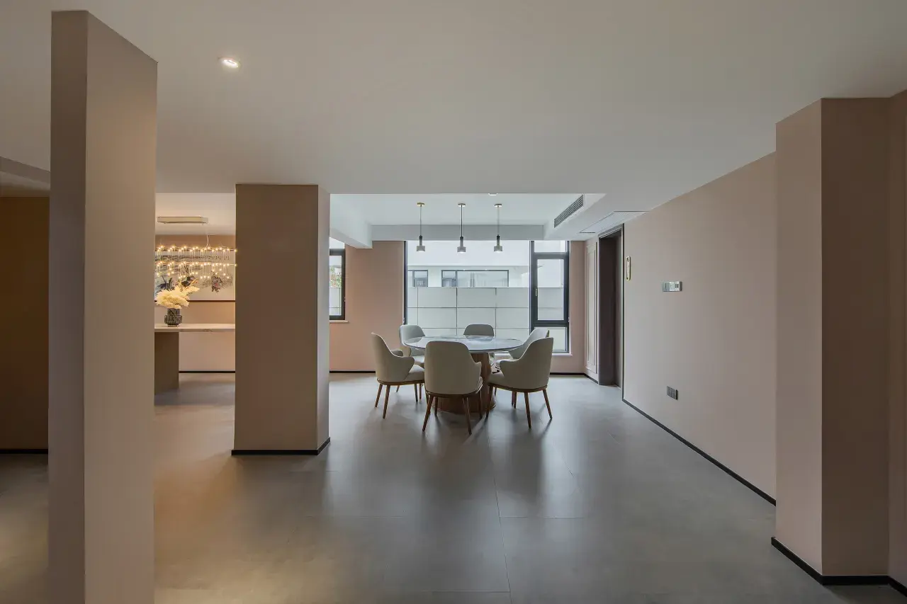 在四周蓝天碧峰的环绕之下,白色的墙地砖石材,质朴温润的墙面材料,给人一种高级又优雅的感觉。