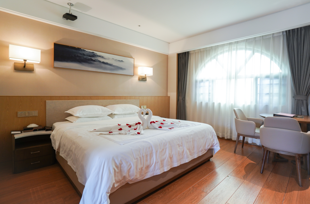 3、温泉大床房:1张2米X2米大床,位于酒店1号楼2-4楼,高档床配置:2张1.35米X2米床,位于酒店1号楼2-3楼,房间免费茶包、矿泉水及免费WiFi