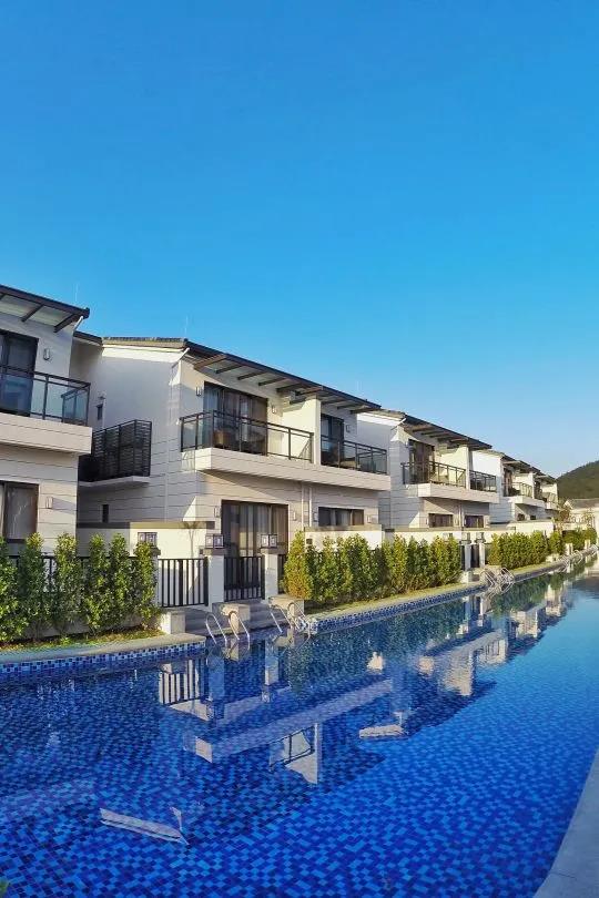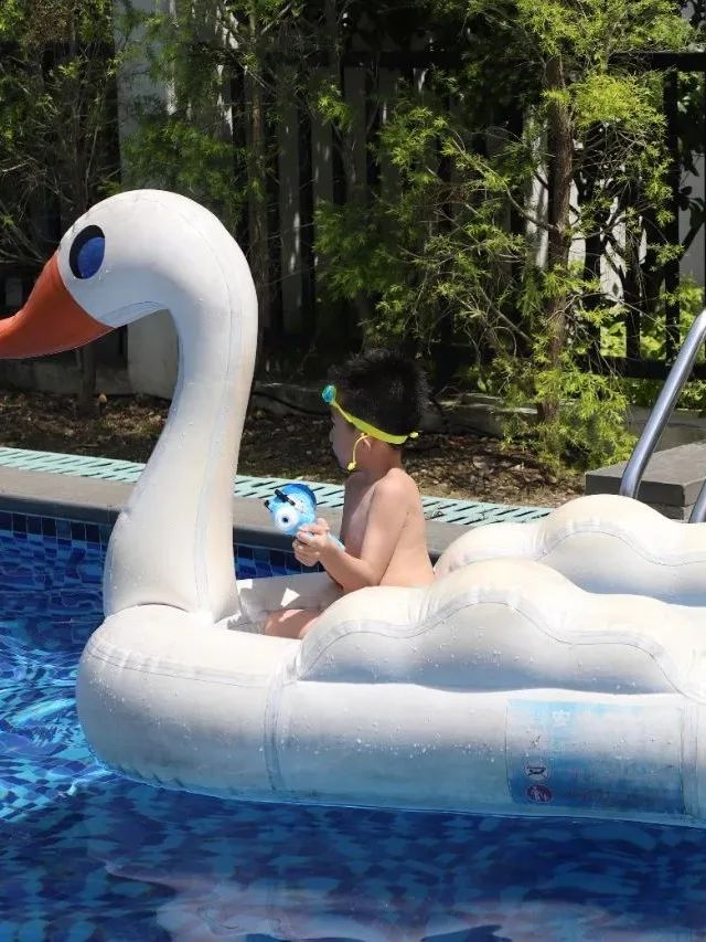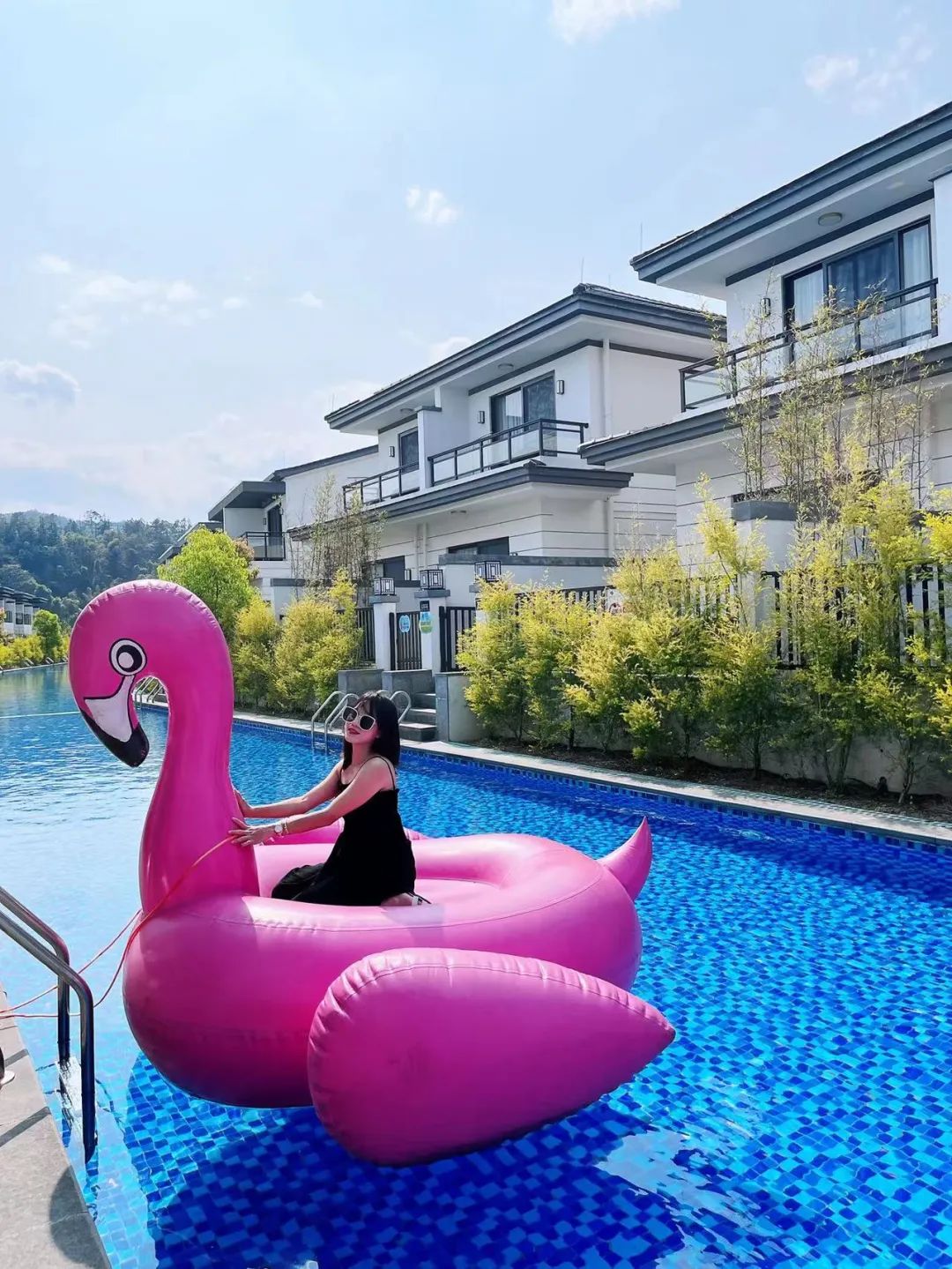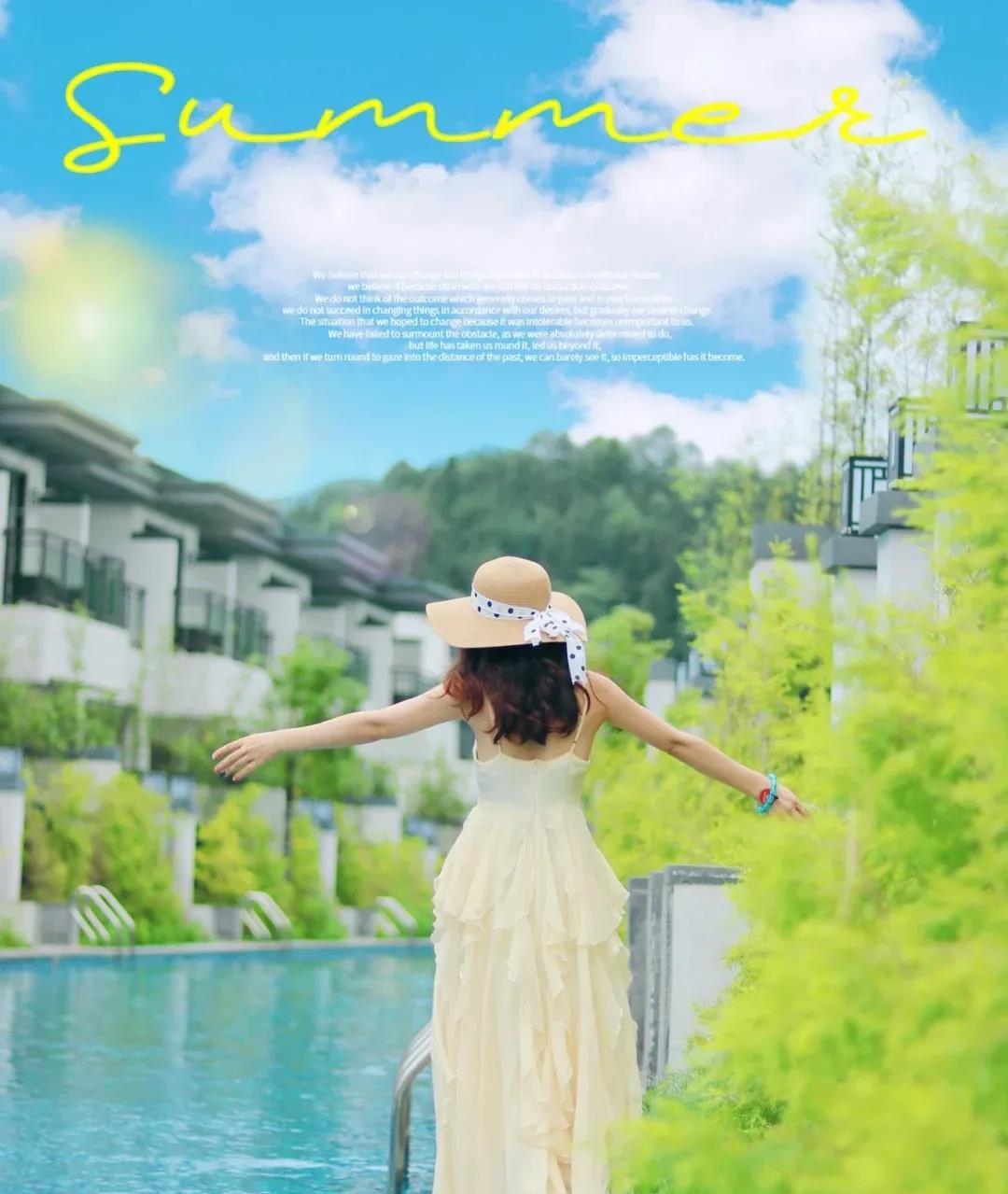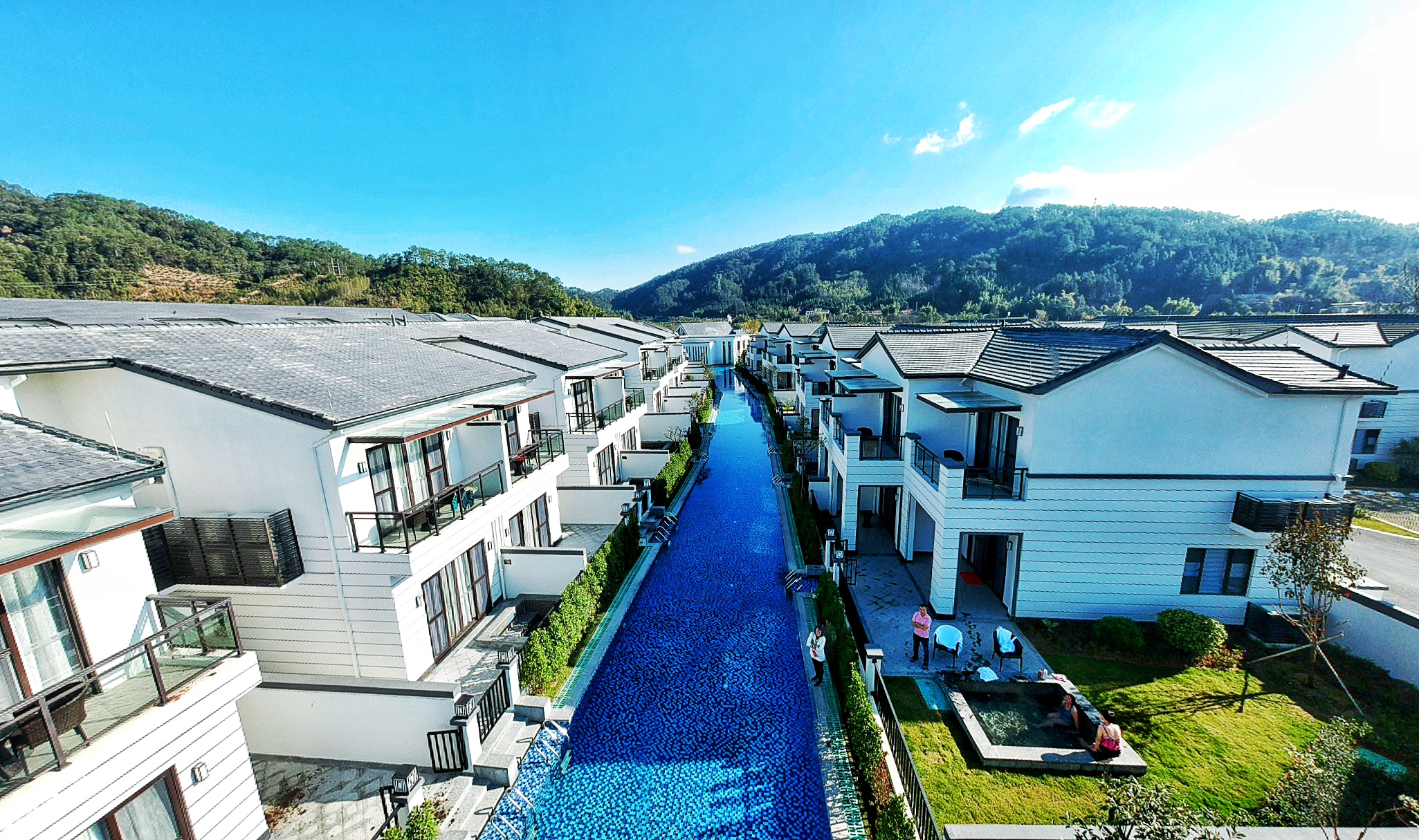 白墙黛瓦,湛蓝的泳道在阳光下分分钟秒出大片
