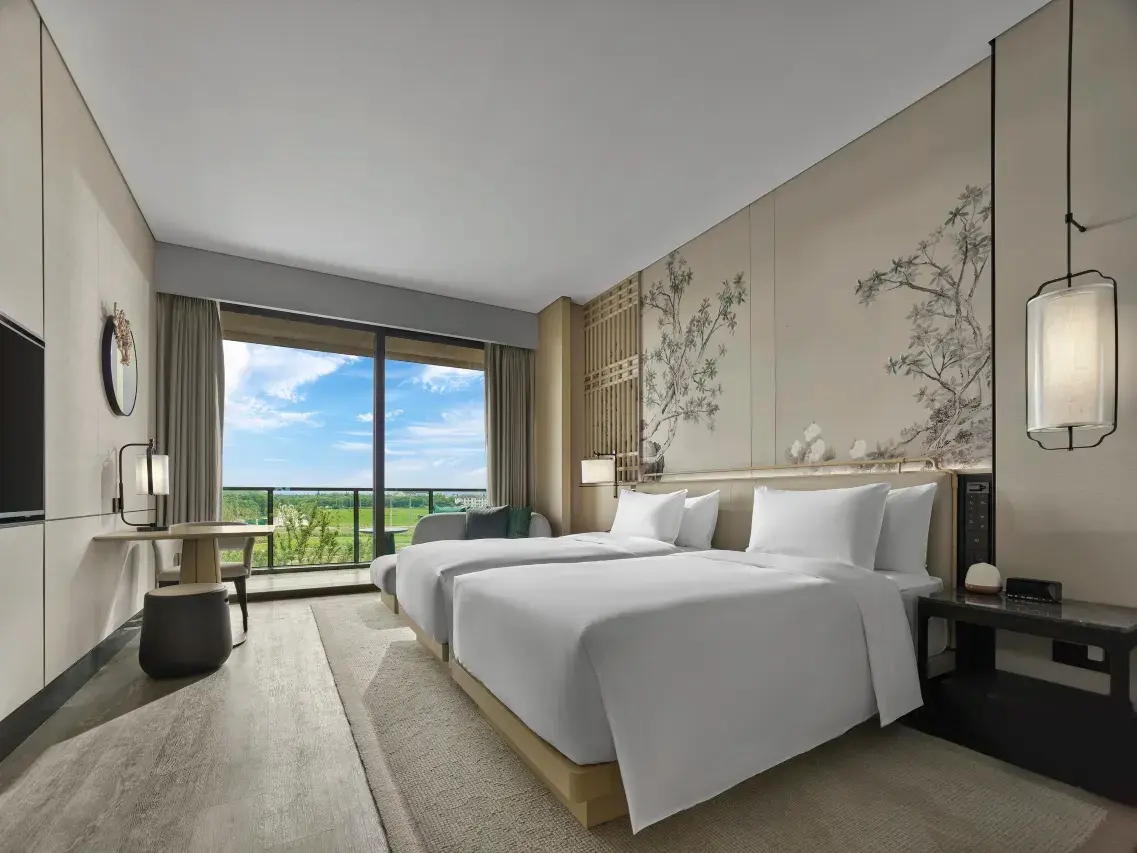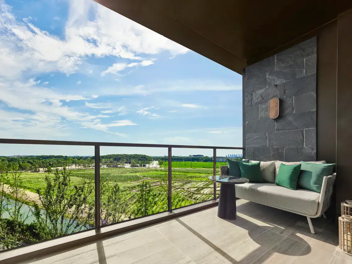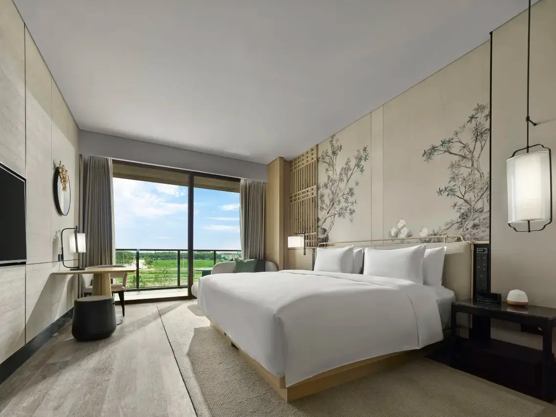 210间客房田园房、园景房、田园房、花岛房、、庭院房、庭院养修房、园景养修房,面积35-52㎡。内设计简洁典雅,给人出尘避世的隐逸感。