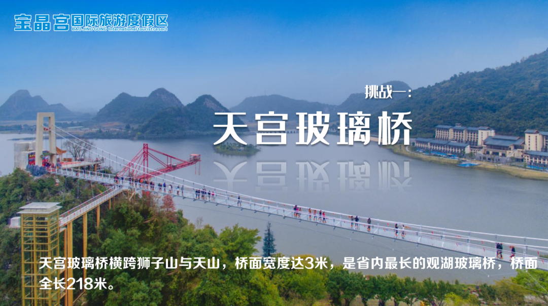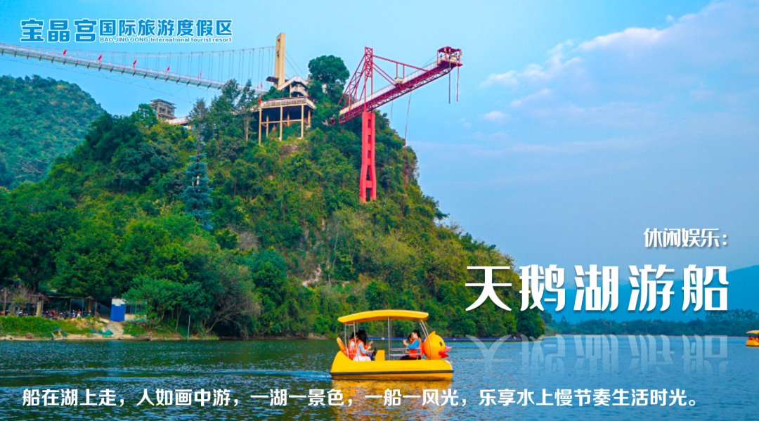 宝晶宫超丰富的配套玩乐项目:高铁小火车、飞龙蹦极、天宫玻璃桥、亿年溶洞,天鹅湖飞索、丛林穿越、卡丁车、天鹅湖游船、孩子最爱的天鹅堡儿童乐园...