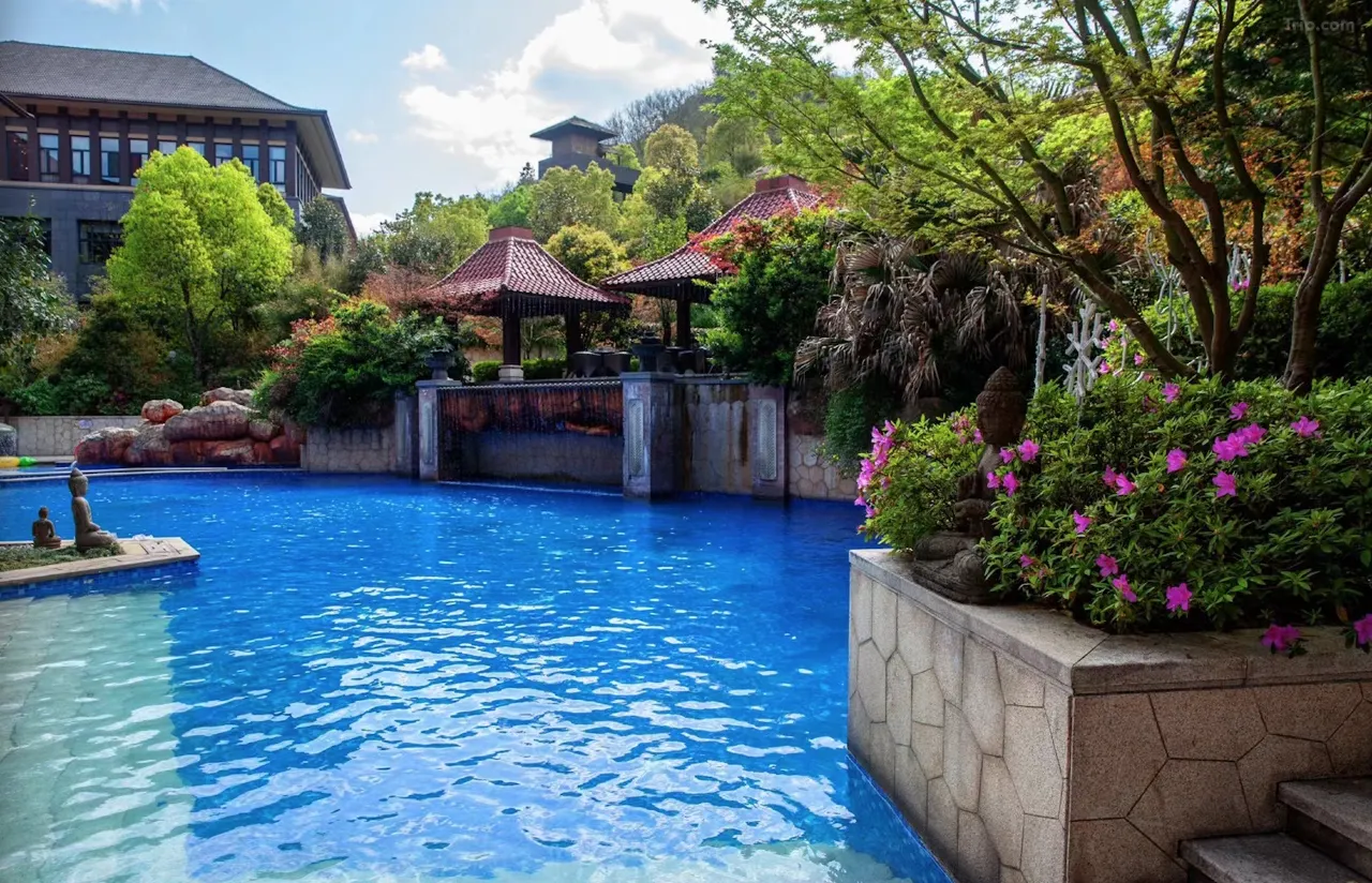 临安湍口众安氡温泉度假酒店,背靠群山,占地6.9万平米,坐拥百亩绿色景观,建筑外观为东南亚风格,是华东地区规模宏大的温泉度假胜地之一。