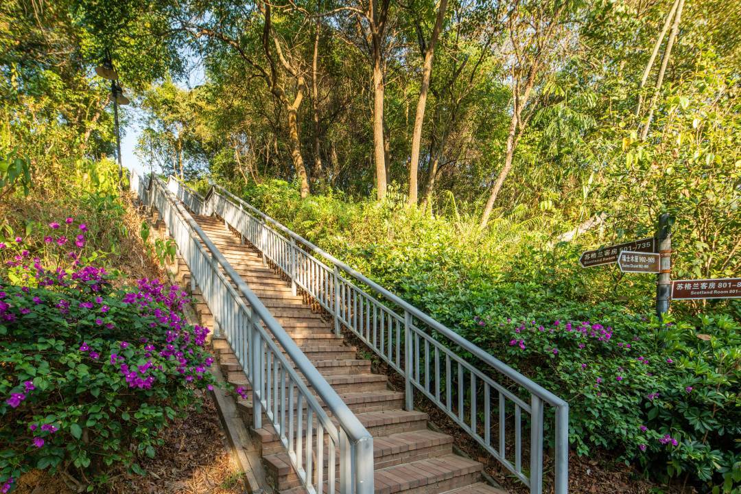 园区内保持原生态环境,结合了水、林、泉、果巧妙的风景结构和良好的生态环境,从高处眺望,宛如一座中世纪的城堡点缀在崇山峻岭之间,气势磅礴、雄伟壮观
