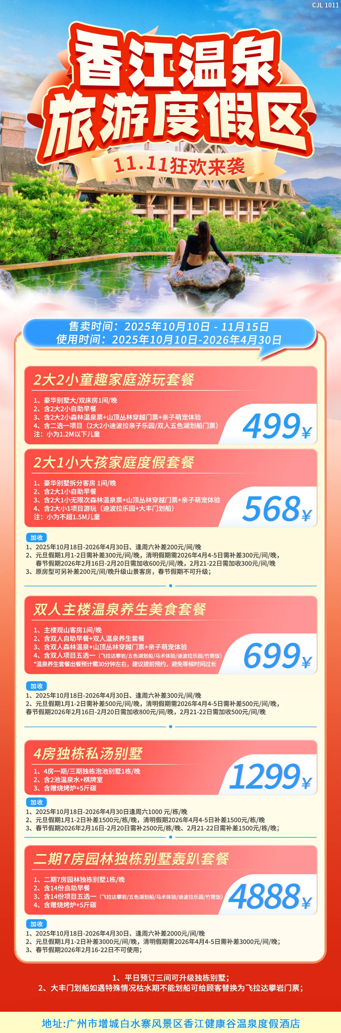 1、2025年10月18日-2026年4月30日且逢周五需补差100元/间/晚、逢周六1000 元/栋/晚