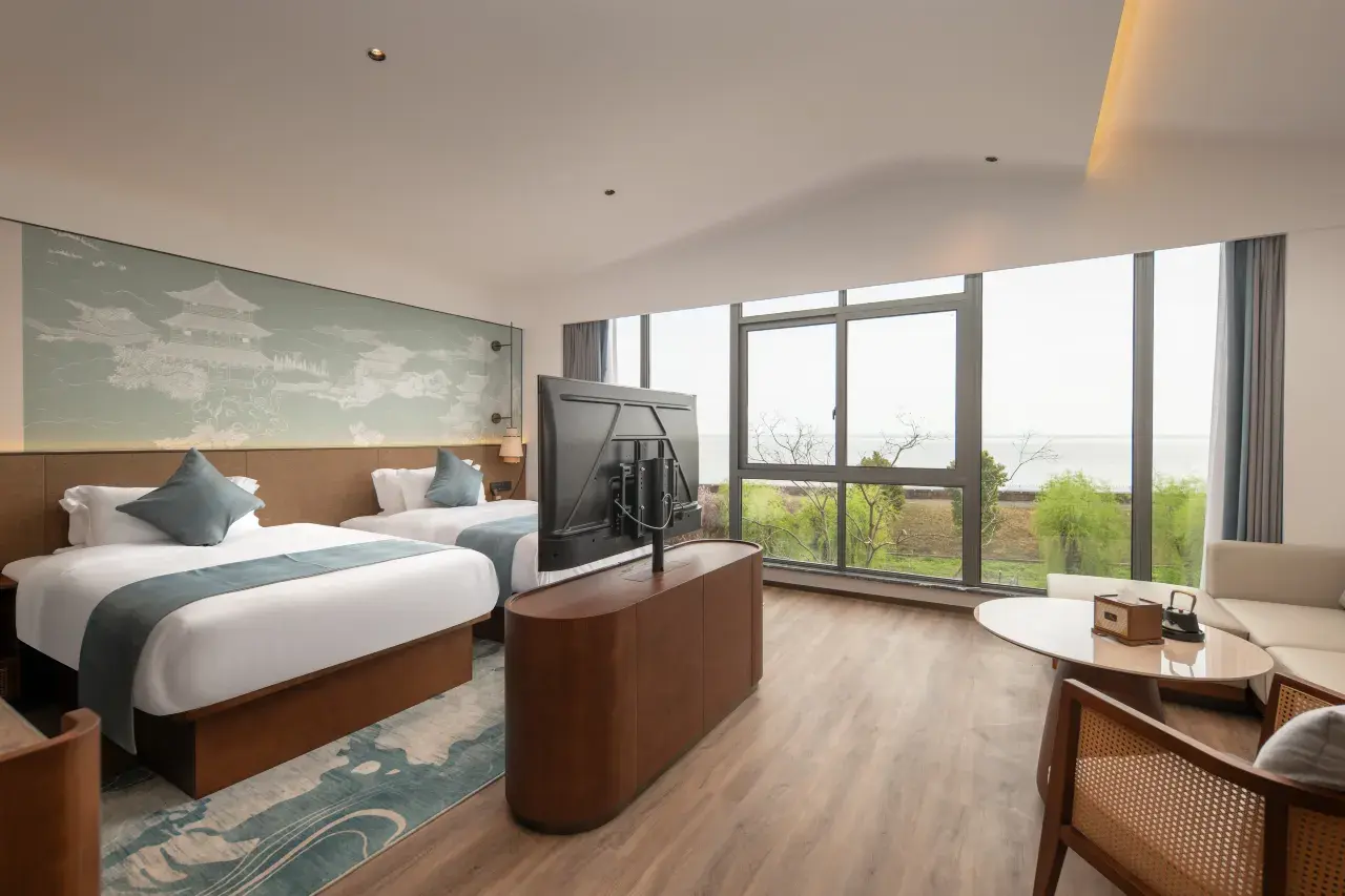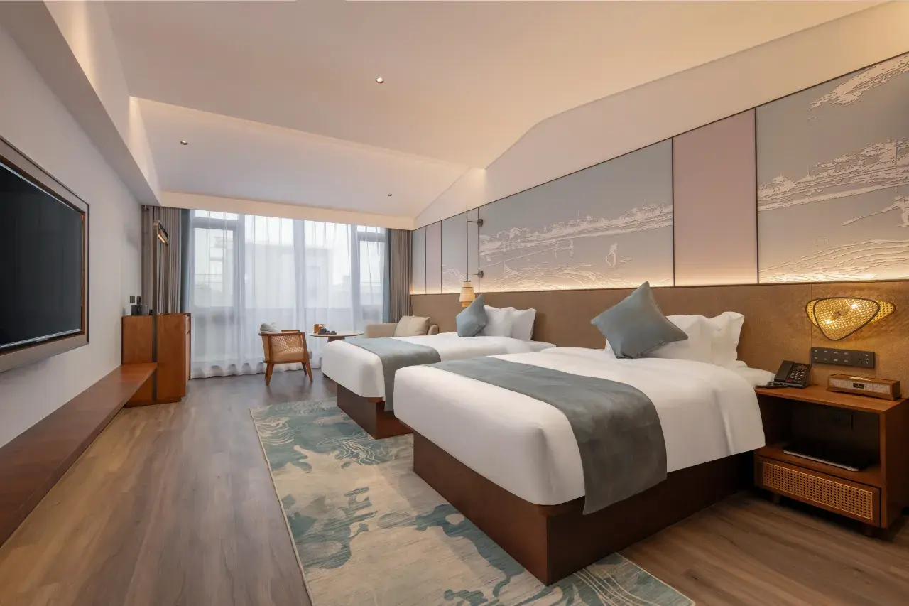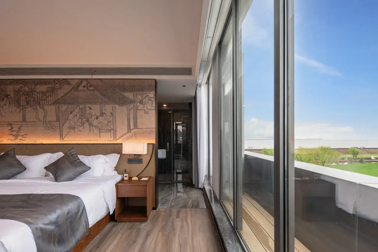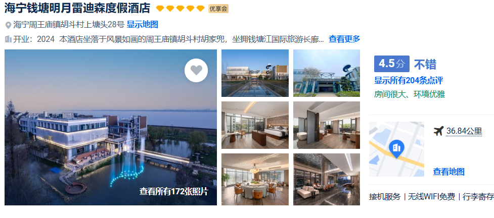 酒店坐落于浙江海宁钱塘江畔,雷迪森度假酒店以“明月映江潮”为设计灵感,将现代美学与江南水乡风情完美融合。酒店紧邻观潮胜地,背倚葱郁园林,独享静谧与壮阔的双重体验,是商务出行、家庭度假、浪漫旅居的理想之选。