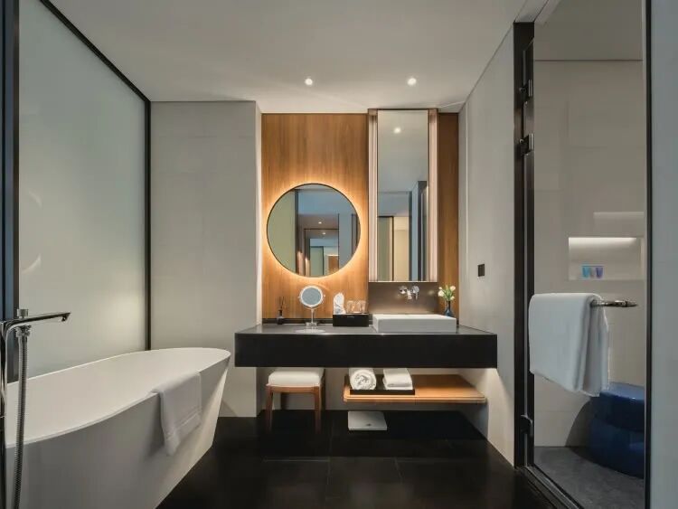 客房内配置特色天目盏茶壶及茶杯;床垫为美国的金可儿品牌,贴合身体曲线,打造健康舒适睡眠;以及美国科勒品牌智能座便器,为您提供高科技的便捷服务。