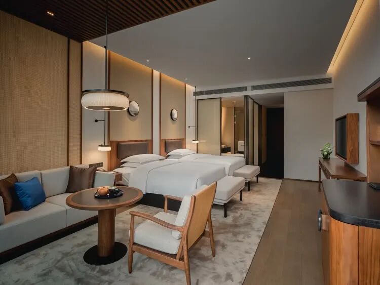 每间客房均配有观景阳台或独立庭院,推窗见景,尽情饱览天目山山景和酒店园景,尽享诗意氧居生活。返璞归真的设计及沉静内敛的色调搭配,让人不知不觉静心下来。