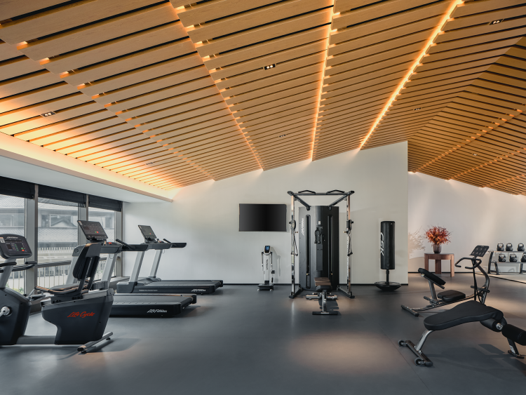 健身房位于泰悦雅颐养生二楼,总面积为100平米,提供有氧和无氧训练的健身器材。