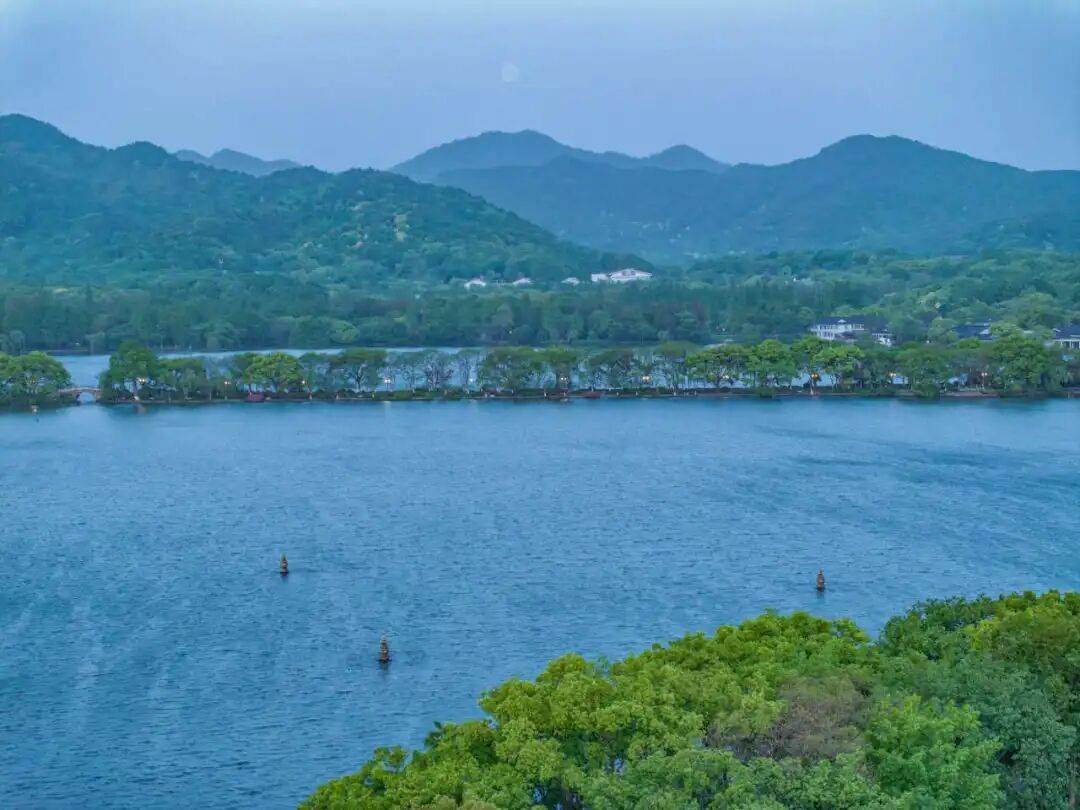 从五层俯瞰,整个西湖尽收眼底:三潭印月、断桥、苏堤、白堤清晰可见,远处的青山与市区的高楼相映成趣,傍晚时分(若行程赶得上),还能看到 “雷峰夕照”(夕阳洒在塔身上,金光闪闪),绝美!