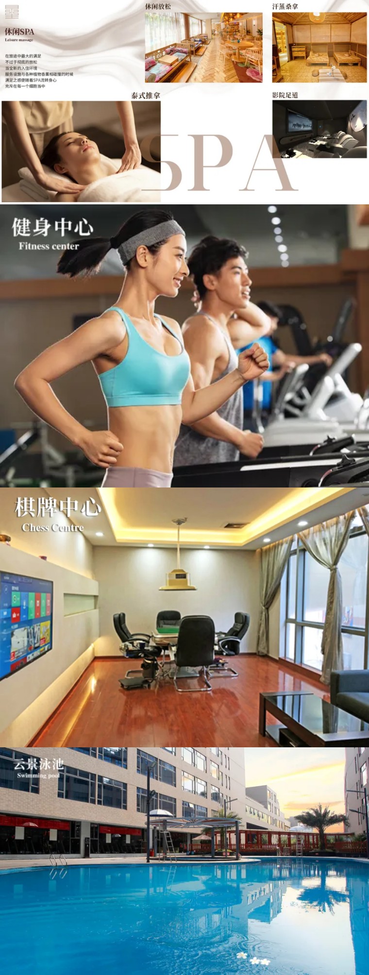 还有休闲SPA、健身中心、棋牌中心、泳池...