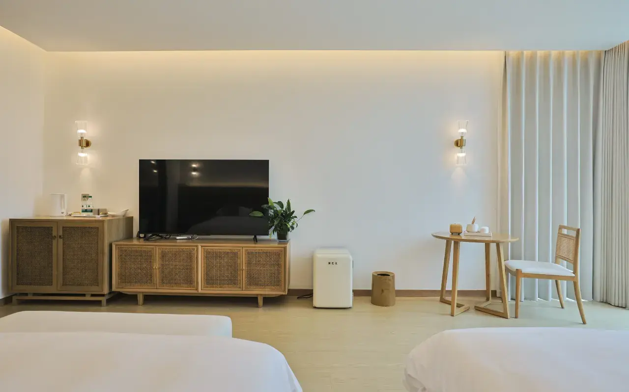 客房统一采用了原木和素净的色调,整个空间都在追求温馨舒适,去除一切多余,更能体会到本真,每一间房都留有观景阳台,空间通透,贴近自然,尽揽美景。