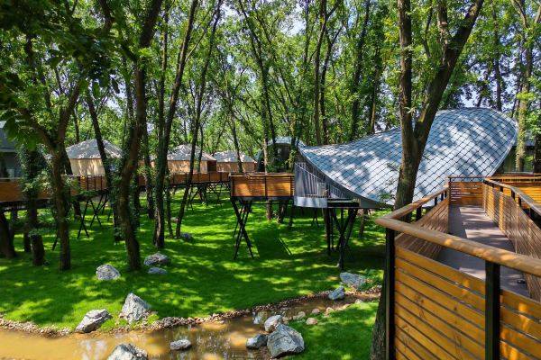 万山绿乐园童廿树屋坐落于庐江县万山镇卅埠村,依托当地优秀的自然景观,在长冲河畔依一片枫杨林建造15栋树屋。还配套无限动物农场、MIMO乐园,亲子教室、水岸乐园等游玩体验业态。