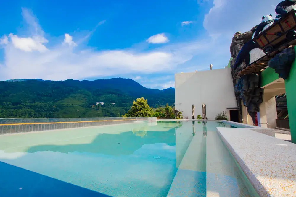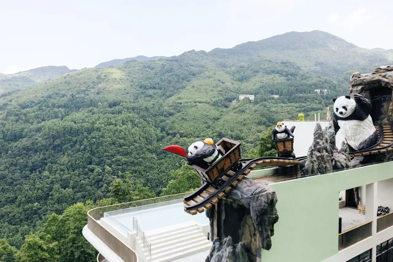 原舍嘿矿熊猫民宿由老龙洞煤矿旧址改造而成,矿坑崖壁、碎石轨道被巧妙保留,变身亲子泳池、星光餐厅、艺术空间。
