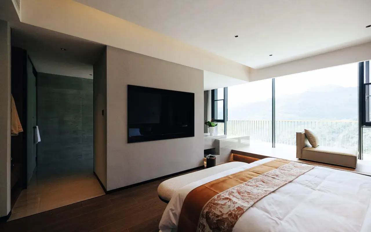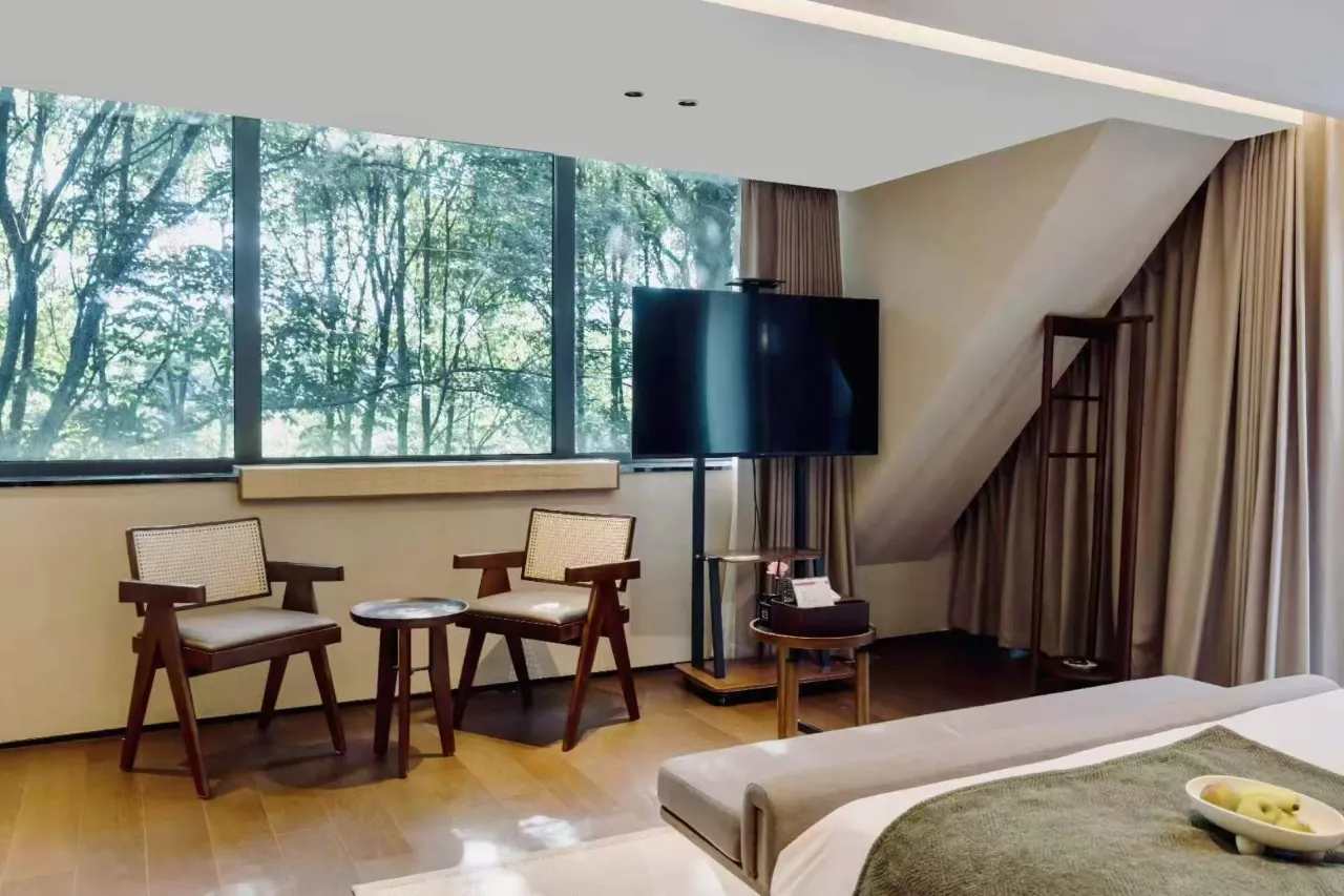 原舍的房间,都可以看得到风景。随便一扇窗,都是一个绝佳的画框。本次套餐的房型是山景阳台大床房/竹海·山景阳台亲子双床房。