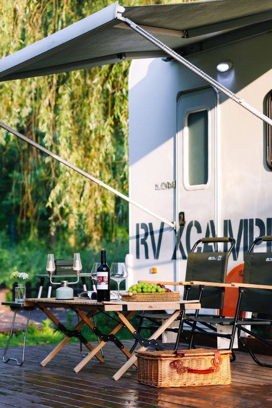 每辆房车都拥有一方独立户外庭院。你可以在庭院中的木平台自由搭建天幕或是坐在木平台边垂钓赏景。