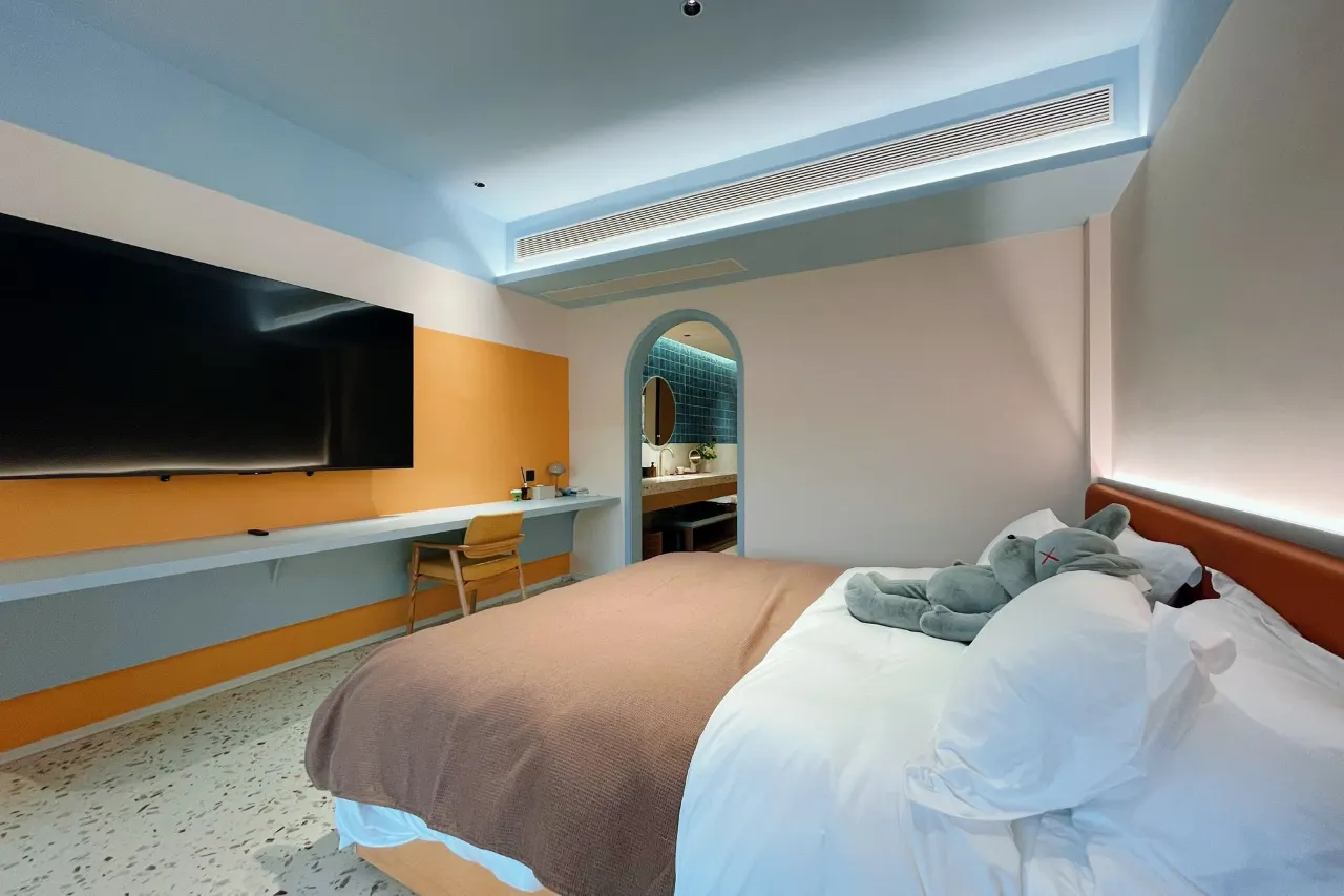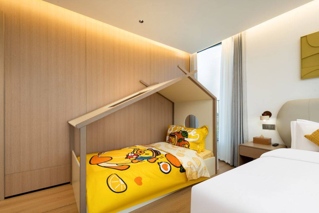 彩虹步道、巨型小黄鸭雕塑、手绘涂鸦墙等元素贯穿整个度假村,从入口到客房区,每一步都充满童趣惊喜。从大堂到走廊,B.Duck元素无处不在:马赛克壁画、桃桃鸭主题装饰、萌化人心的儿童活动室。