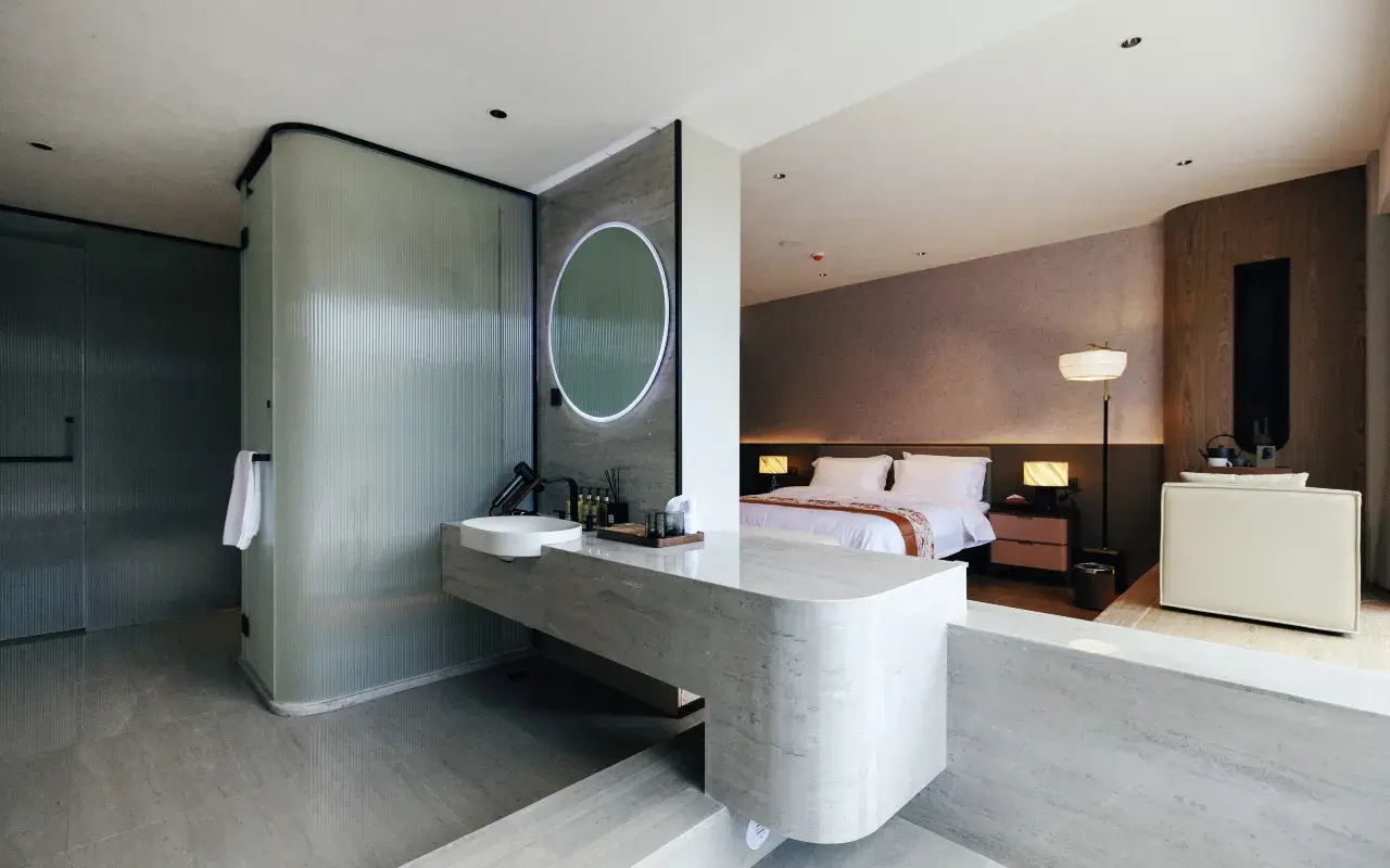 自然留白去装饰化的简约设计出自著名建筑设计师闫明之手,随处可见的几何形状就如相机取景器,将不同的风景透过“几何取景框”载入你的眼帘。
