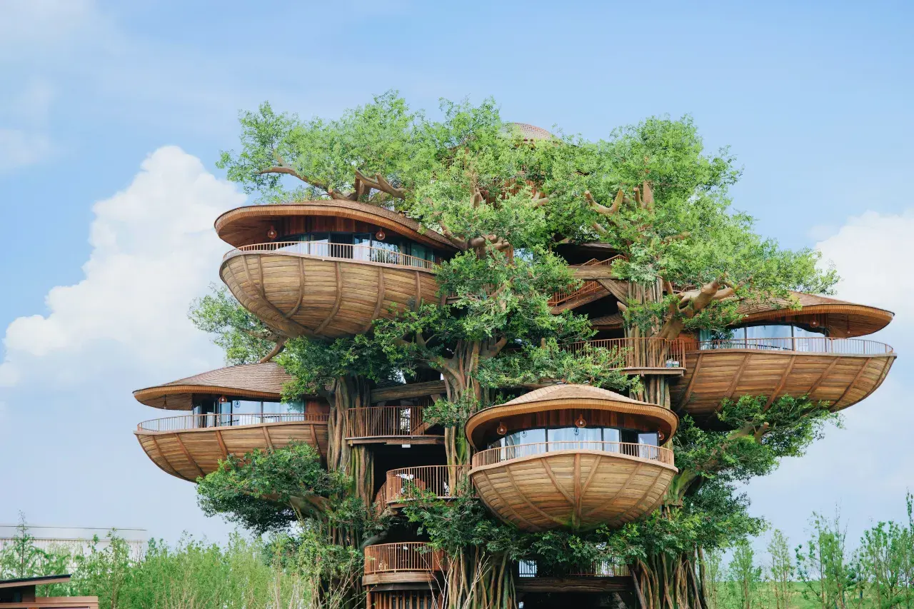 树屋大床房房型外观是一棵生机勃勃的绿树。拾级而上,宛如误入童话故事王国的精灵。