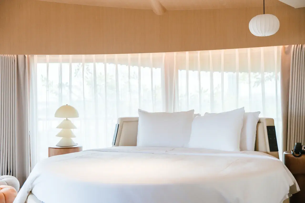 推开门,柔和暖光倾泻,温馨氛围瞬间包裹周身。简约雅致的大床,铺陈洁白柔软床品,每一寸都似在轻唤疲惫灵魂安然休憩。一旁木质床头柜,精致花瓶中几支鲜花悄然绽放,为空间添上一抹灵动诗意。