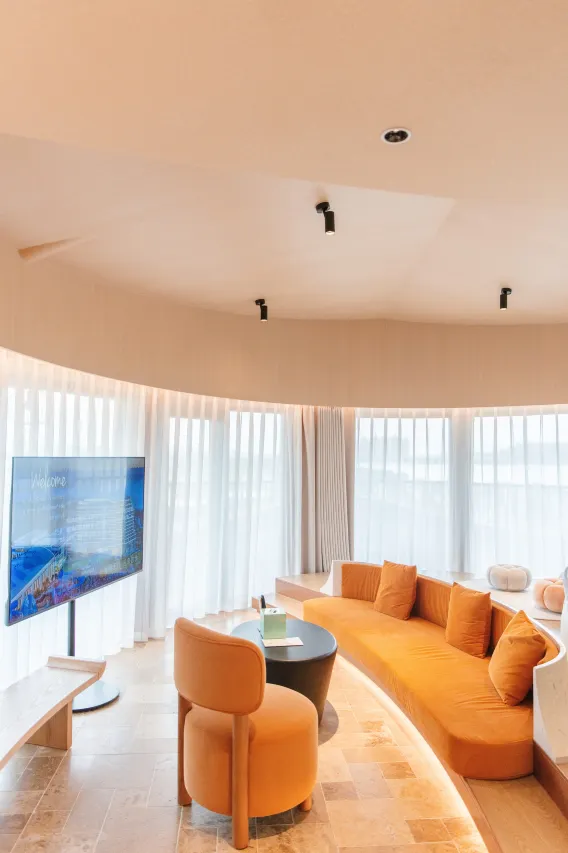 窗边,舒适沙发静候,抱枕错落有致。落地窗外,湖光与城景交融,远处建筑与碧波相映成趣。步入阳台,微风轻拂,目之所及,是开阔湖景与错落有致的湖畔建筑。两把休闲椅、一张小圆桌,桌上花瓶绿植点缀,于此沏茶闲坐,或赏景放空,或与友谈天,时光都变得悠然缓慢。