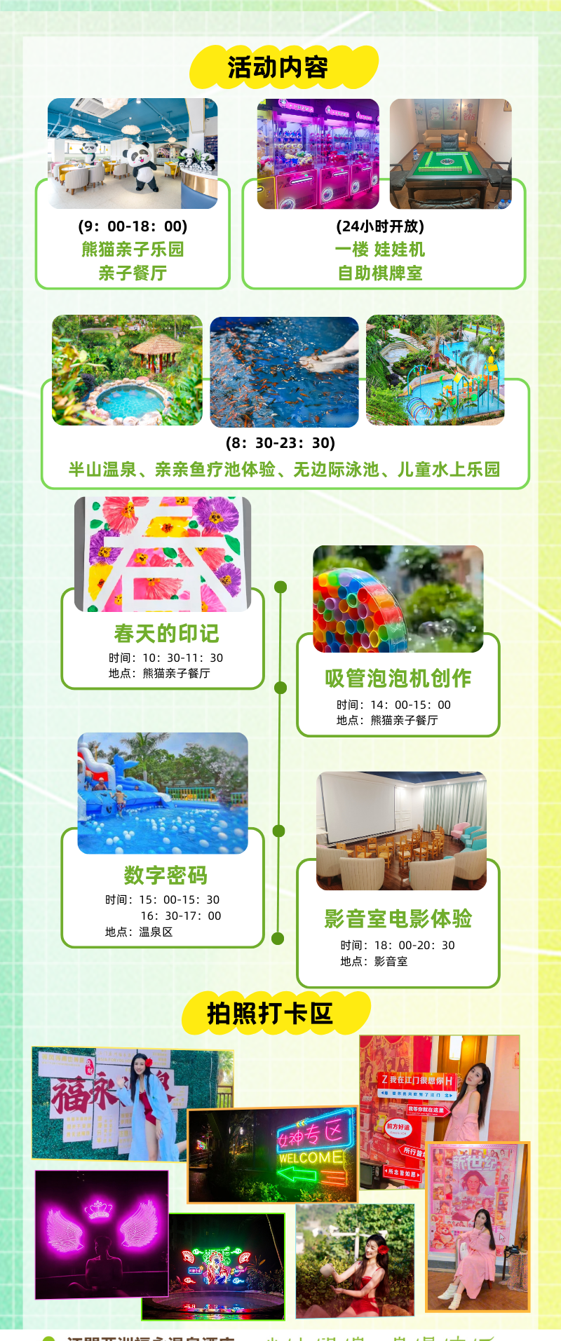 6、福永温泉开放时间:8:30-23:30,酒店共有28多个温泉泡池(开放时间和温泉池数量具体以现场为准),住客可在入住时间内不限次进出浸泡温泉,山水泳池和水上乐园开放时间以酒店现场为准,水上乐园和泳池正常开放,如遇上清洗或设备维修不开放,不做单独退款,敬请谅解,水上乐园和泳池开放时间以酒店现场为准,若天气寒冷关闭不作为单独退款,敬请谅解