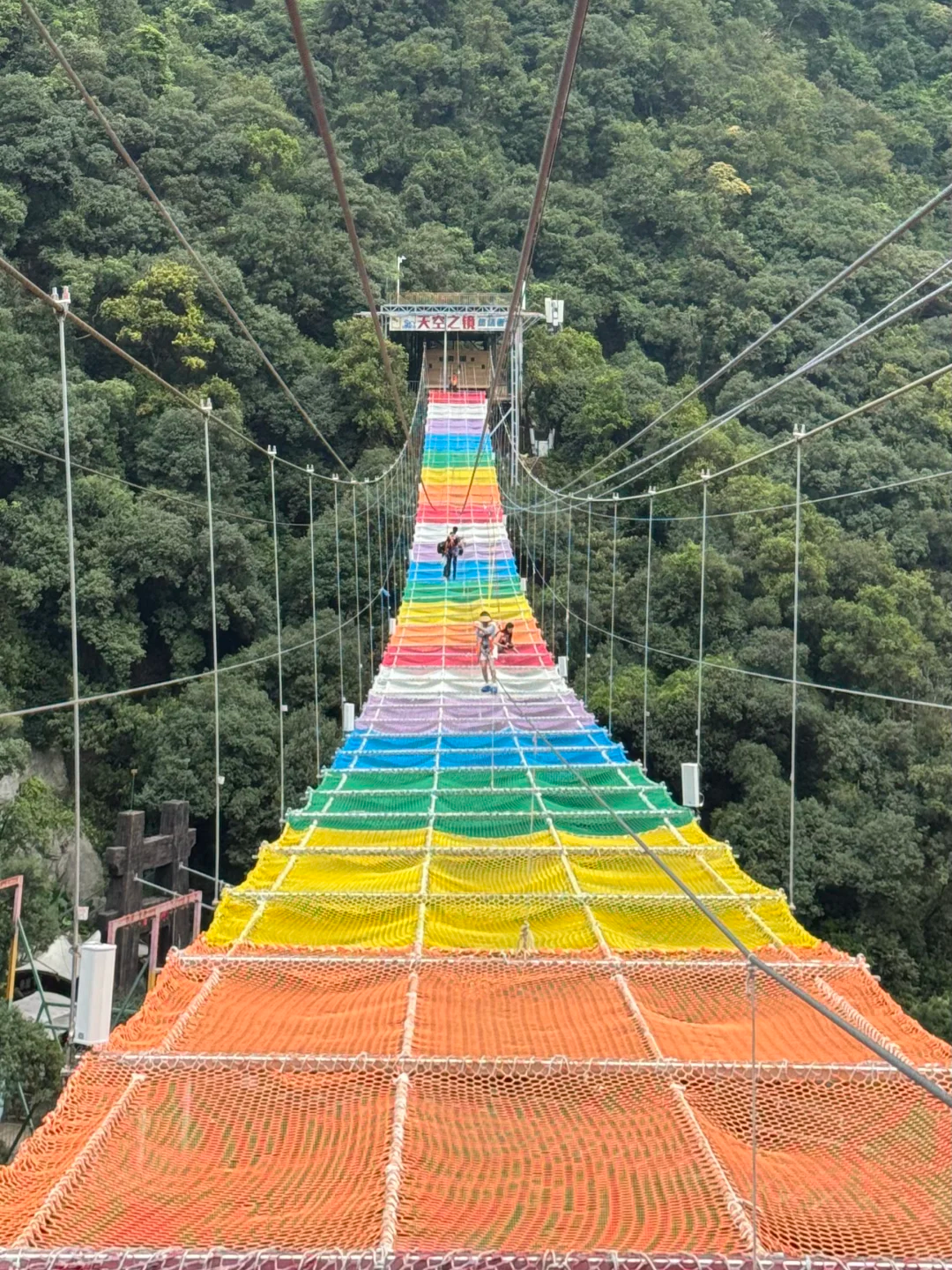 往前走时网面微微晃动,低头可见峡谷溪流穿行