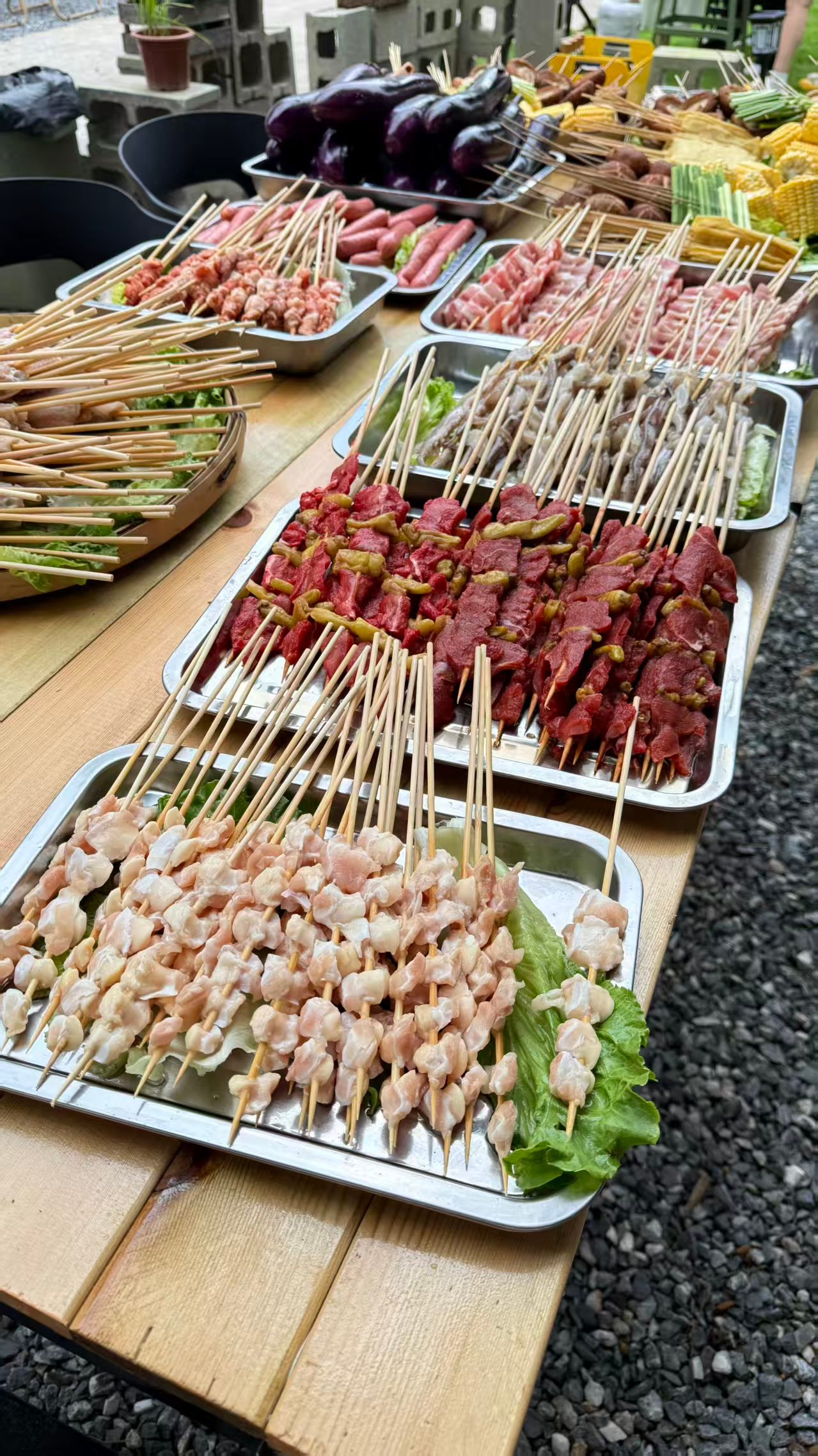 3.烧烤套餐内容:羊肉串:10串、鸡中翅10串、泡椒牛肉串:10串、鱿鱼串:10串、五花肉:10串、掌中宝:10串、肠仔:10条、冬菇串:10串(3只一串)、玉米:4根(共分12段)、蒜心:6串、娃娃菜:6串、生菜:2份、茄子:4条、豆腐串:6串、大可乐:2支,含5斤炭(以民宿为准);
