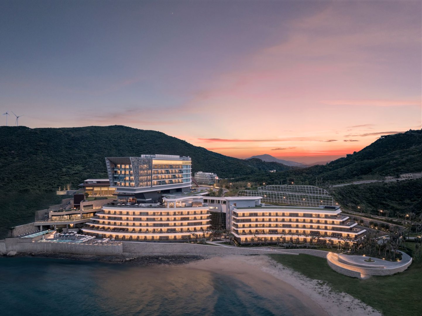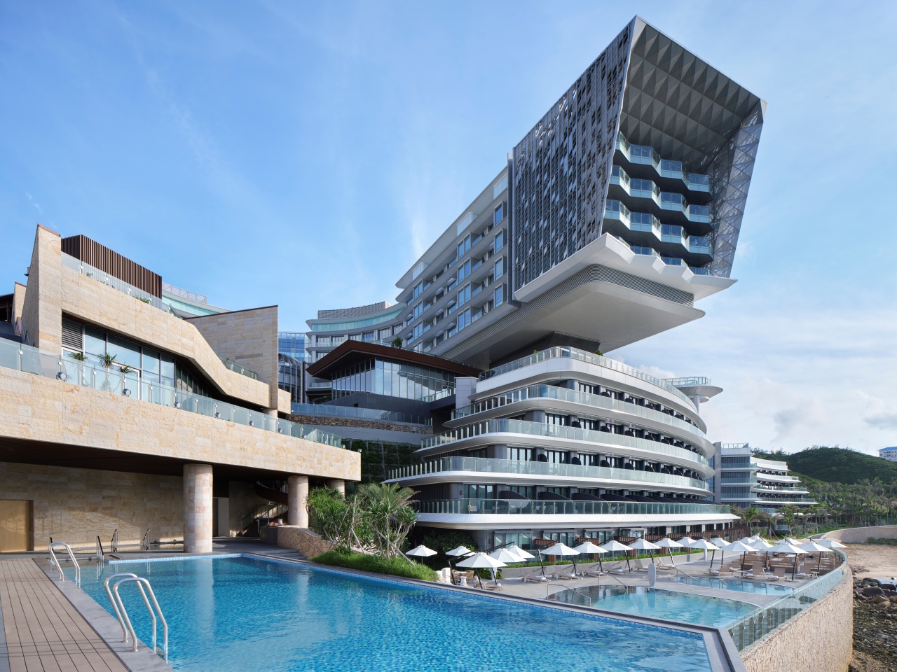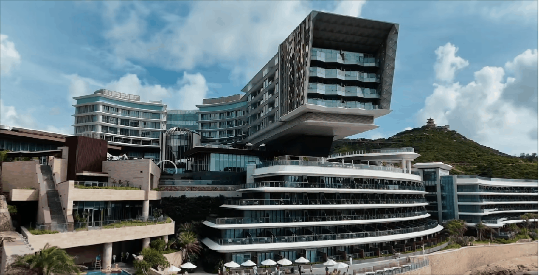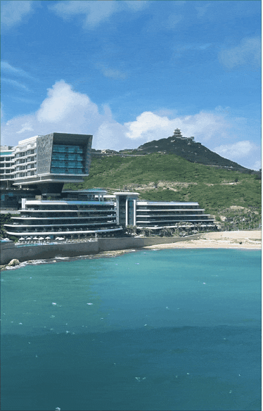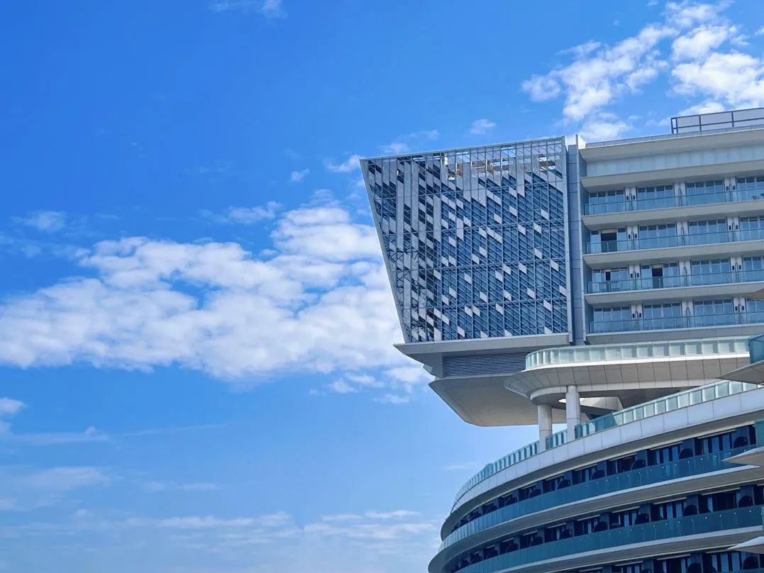 整个建筑在设计上,利用甲板状退台结构的表现形式将楼体打造为停靠在海岸的“豪华客轮”形象,由上至下层层向海岸延伸,进一步拉近了与大海的距离,让人们感受海与风的交融