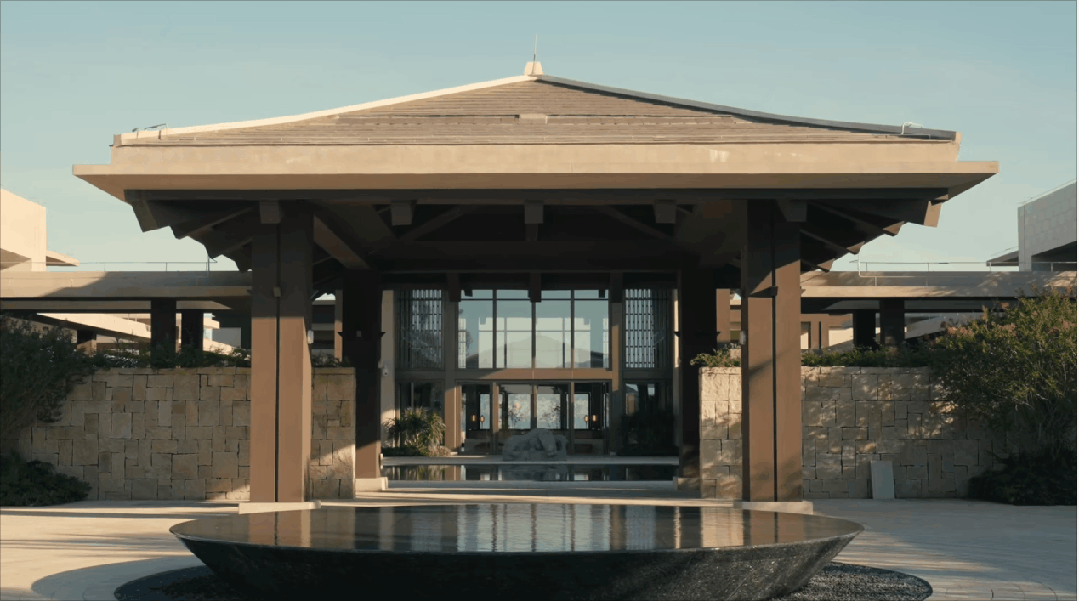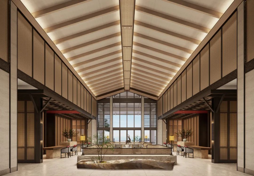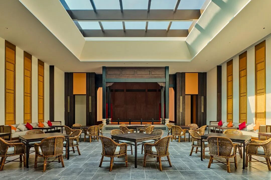 步入酒店,三进式布局对应中式大宅建筑,中间是聚气纳福围合的“四水归堂”庭院,天圆地方的水景台,如明镜映照着四季流转。