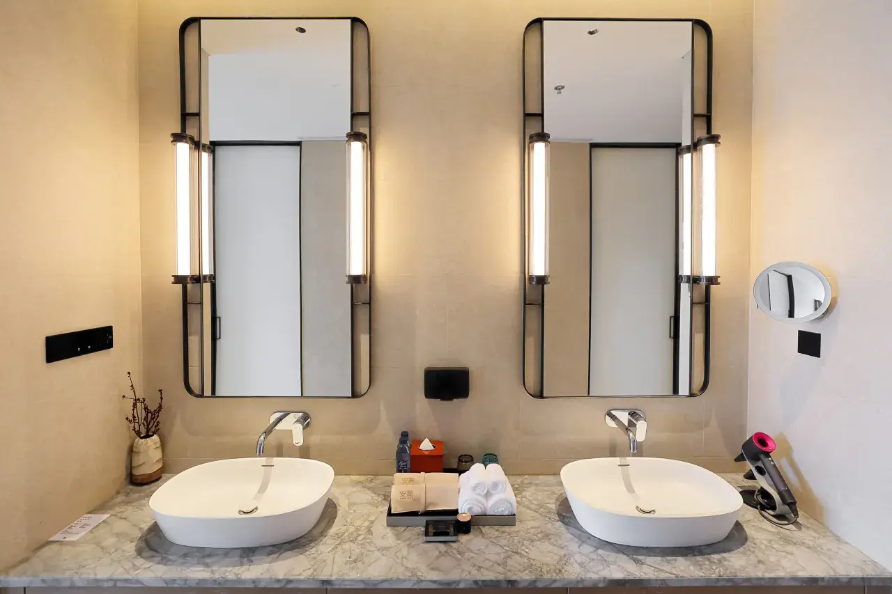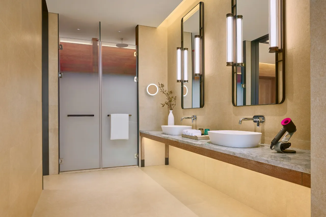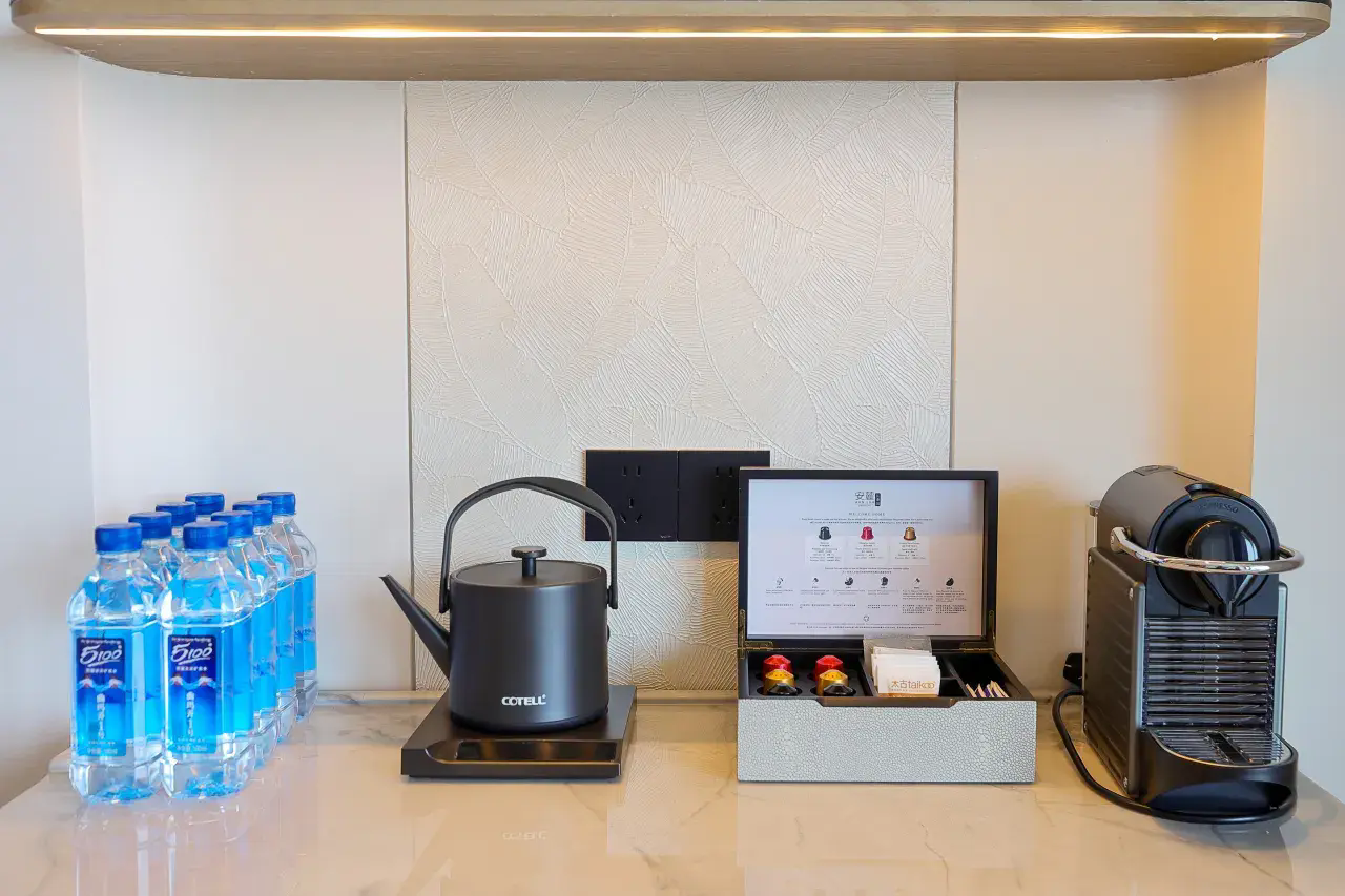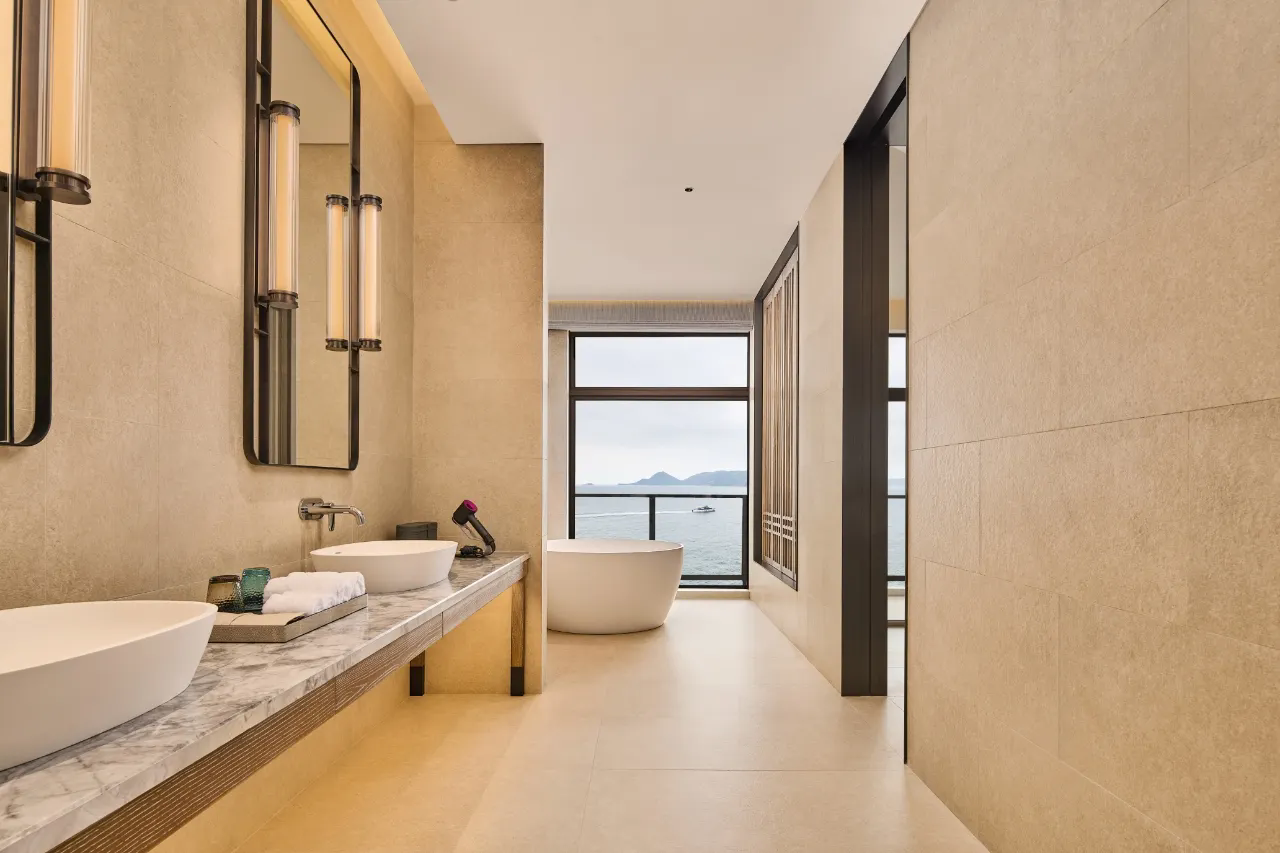 全海景套房,基础房型都达到了72㎡起居空间相当阔绰卫生间配置双台盆临窗的大浴缸,搭配全景落地窗让沐浴时光,也化作极致浪漫体验!同时,客房标配戴森吹风机、马歇尔音响、胶囊咖啡机,精致格调细节彰显!