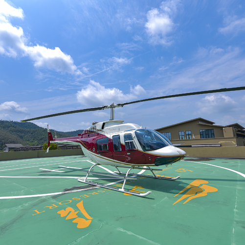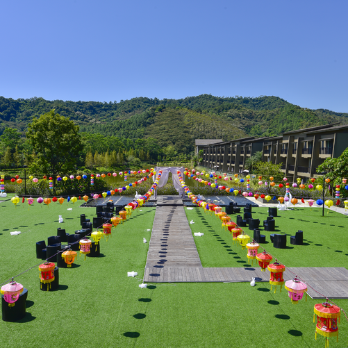 度假村南眺万亩原乡村的田园风光,东西两侧苍翠山脉绵延不断至天际线,仿如两条绿色“绿丝带”。