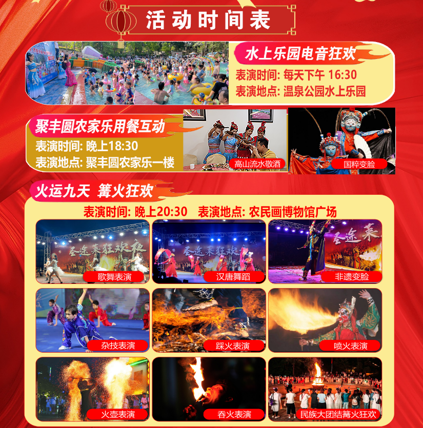 8.每天非遗表演活动具体以现场安排为准,暂定表演有非遗变脸表演、杂技歌舞、杂技表演:烟花瀑布、烽火轮、篝火舞会等,具体演出时间和内容请留意景区指引