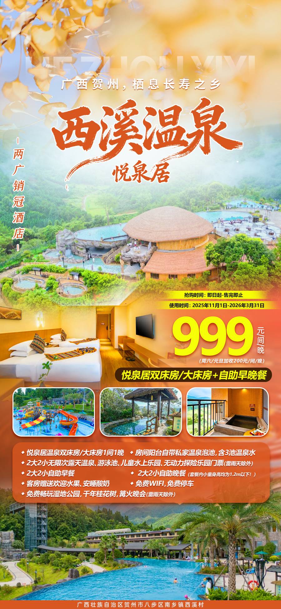 ★ 升级悦泉居二栋两房一厅:周日-周五叠加加收999元/套/晚,周六及元旦1月1日加收1399元/套/晚;