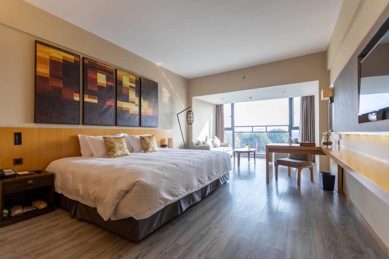 酒店拥有现代化酒店设施、舒适典雅的各式客房195间,本次套餐入住的是高级大床房/豪华双床房,房间布局温馨,闲适时刻还可坐在小凳上远眺窗外风景。