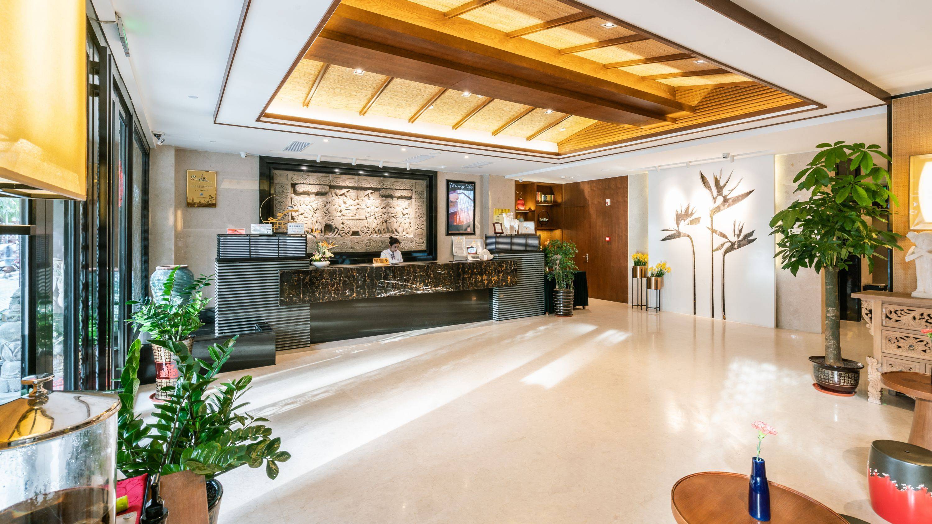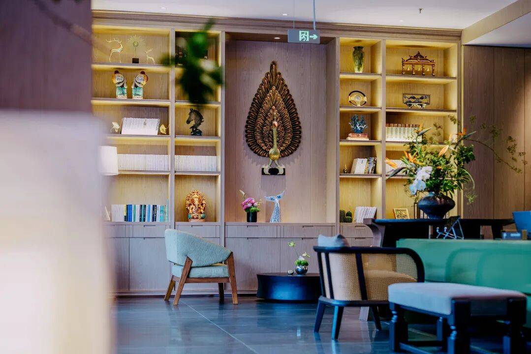 大堂设计风格韵味十足,深色木质设计,前台还刻着一幅巨大的石质浮雕,融合了中式禅意和东南亚风情,步入其中,便能感受到“都市桃源”的美妙,大堂和餐厅藏书丰富,犹如图书馆的一隅,轻松与书香气息撞个满怀。