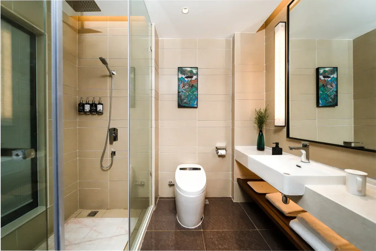 客房全系独立卫浴、浴袍、免费mini吧、大屏LED液晶电视、高速无线WIFI及环保安心用品,24小时服务中心随时为您提供各项服务,让您尽享舒适惬意的入住体验。