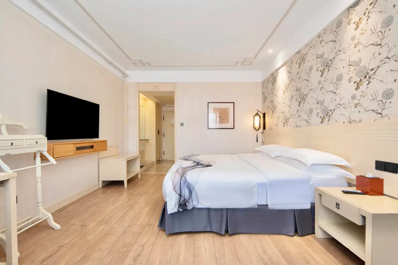 酒店共有172间客房,客房布局优雅又不失情调,精致的鱼鳞木隔断,飘逸的水墨画和古朴的宫灯设计,让这里多了几分东方古典气质。