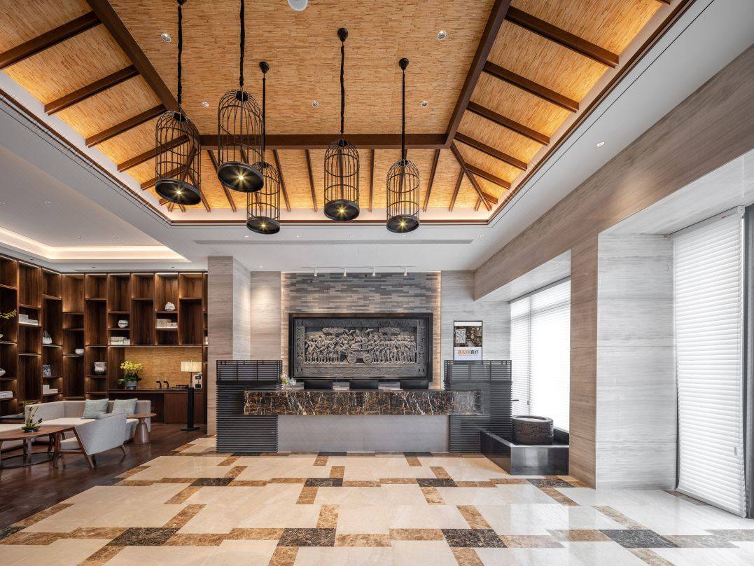 酒店外观高耸宏伟,大堂不同于酒店外表,大堂整体上更加温馨,上方的吊灯古今融合,仿造中式灯笼,设计风格贴合“岭南风格”。