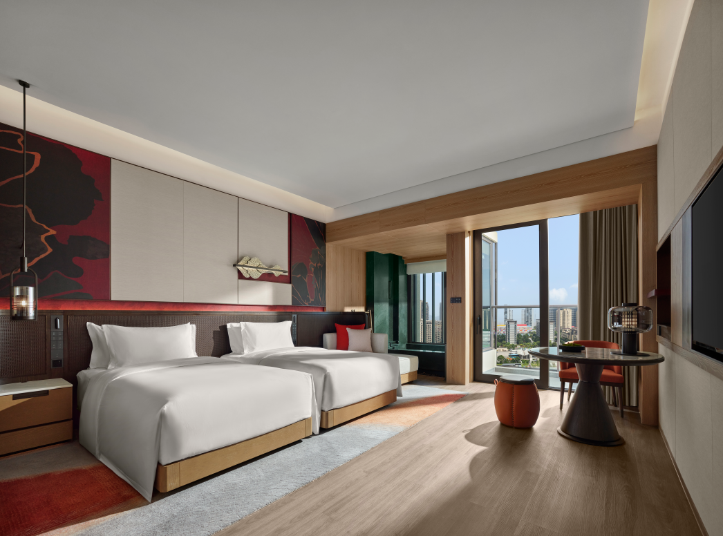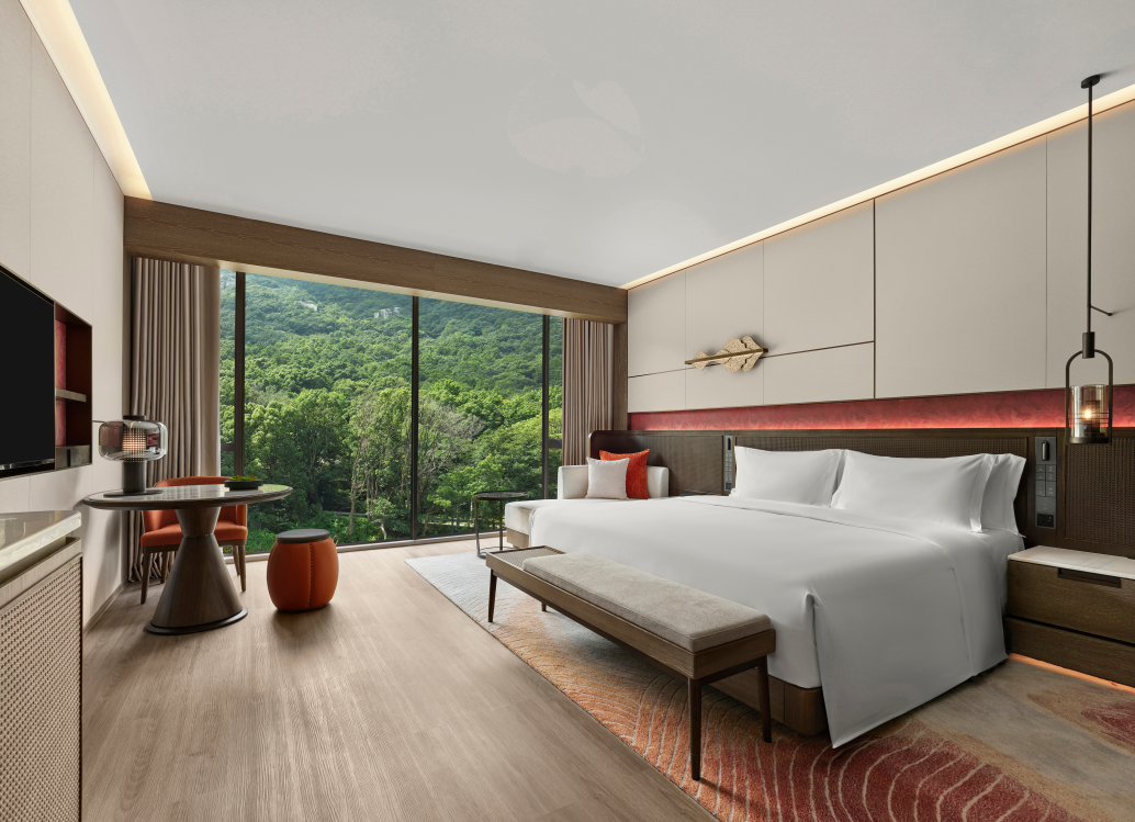 客房运用了大量纹理质朴的木材,温暖的原木色、质朴的藤编,搭配棉麻质感的布艺,营造出舒适、自然的氛围。
