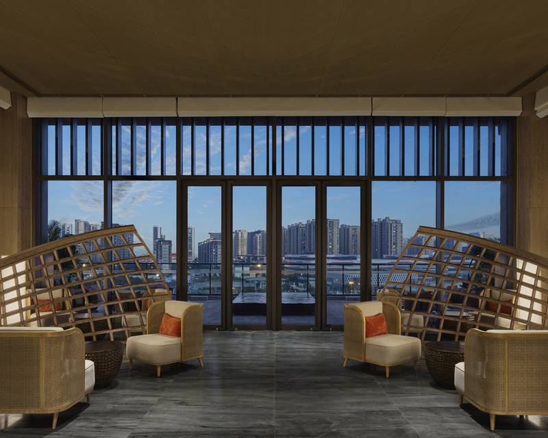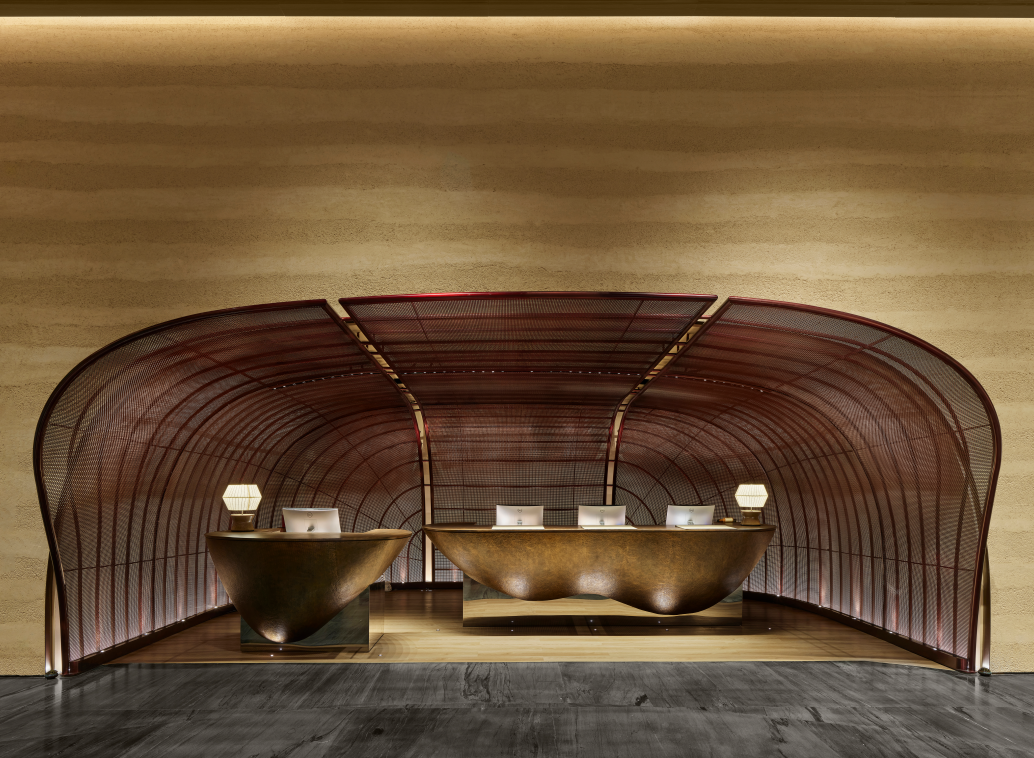 步入大堂,空间灵感源于岛屿与海浪,巧妙转化为如山石般的雕塑与荡漾的波纹。接待台以“岛屿”为意象,锤纹金属细腻复刻岩石的斑驳肌理