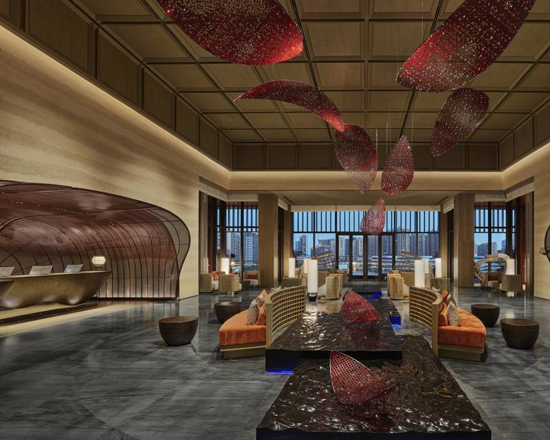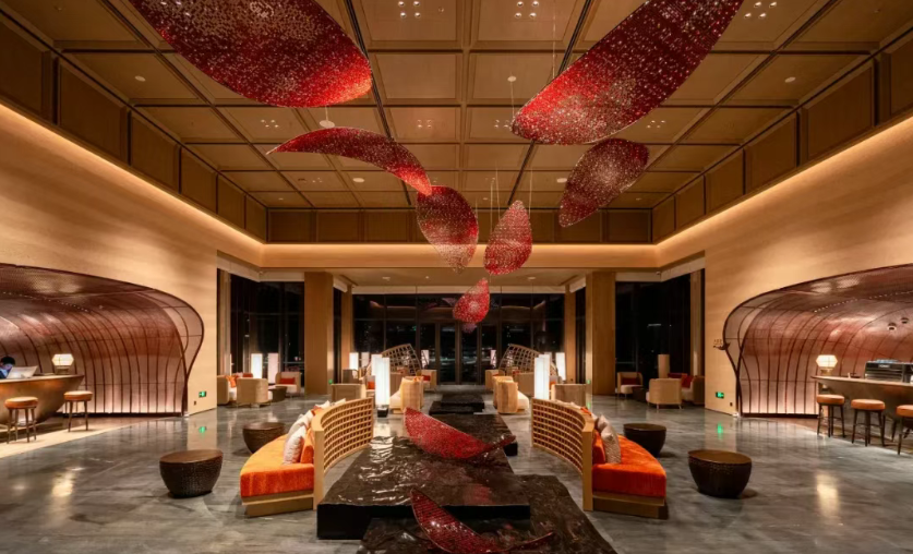 中央休息区被设计成舟山群岛的缩影,天花板上悬挂的巨大红色鱼形或花瓣形艺术装置,所有的色彩,皆取自海岛的自然与人文——那是一幅由海天、码头与花瓣共同挥就的斑斓画卷