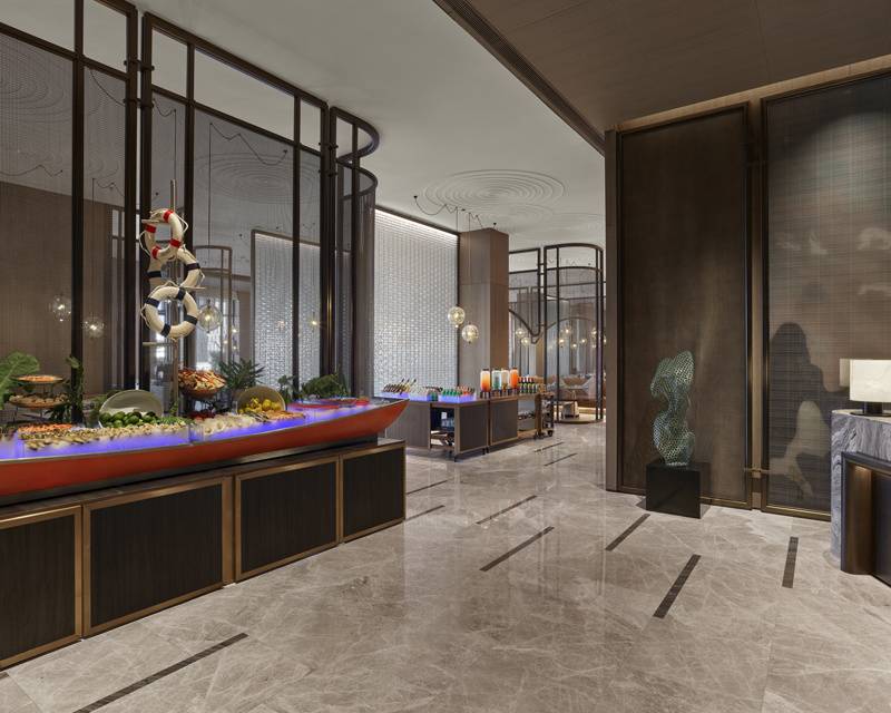 ▲食集餐厅,汇聚环球美味与地道渔家风味,自助餐台琳琅满目,满足探索欲与烟火气