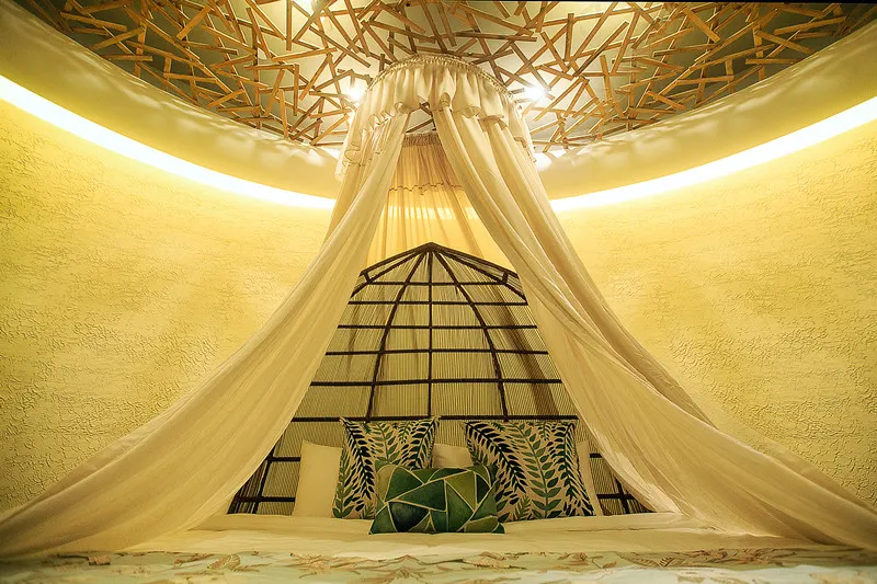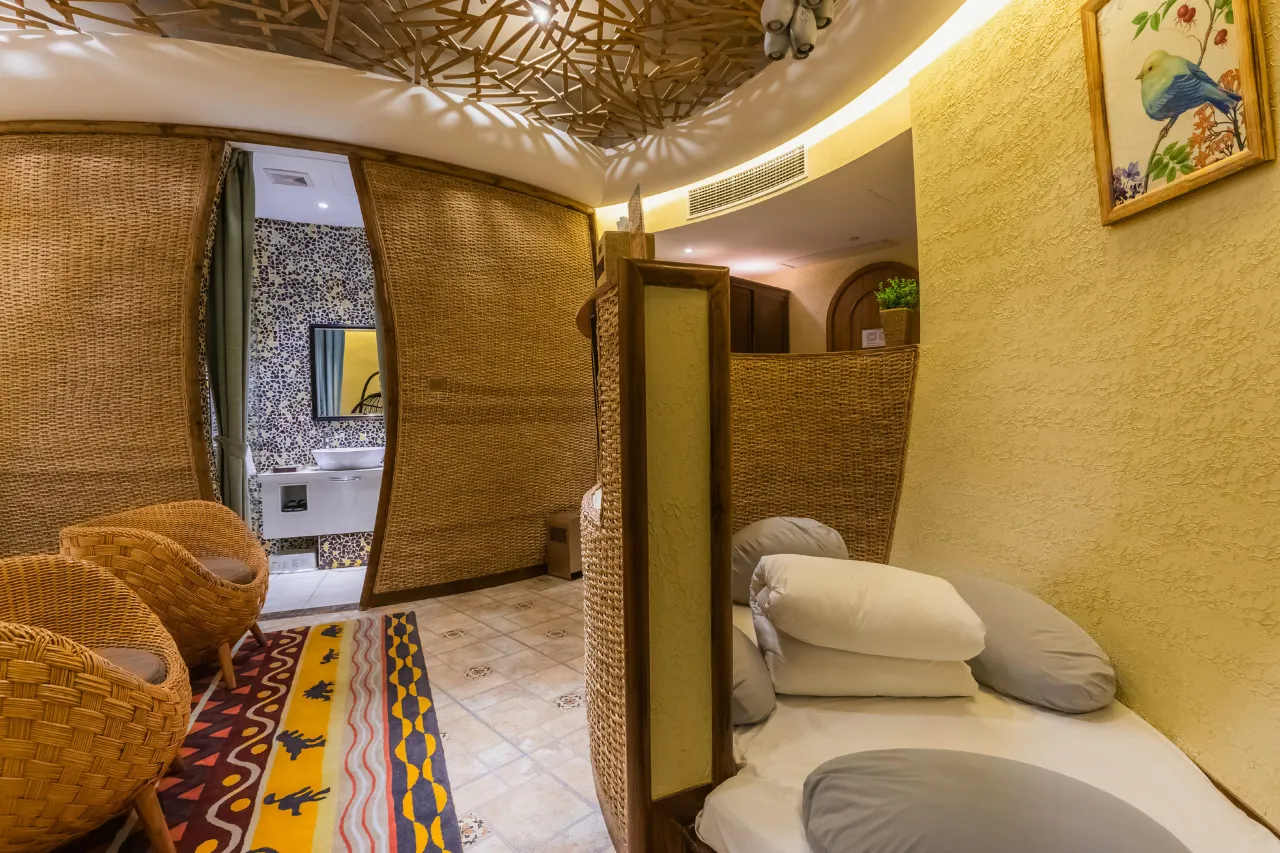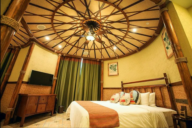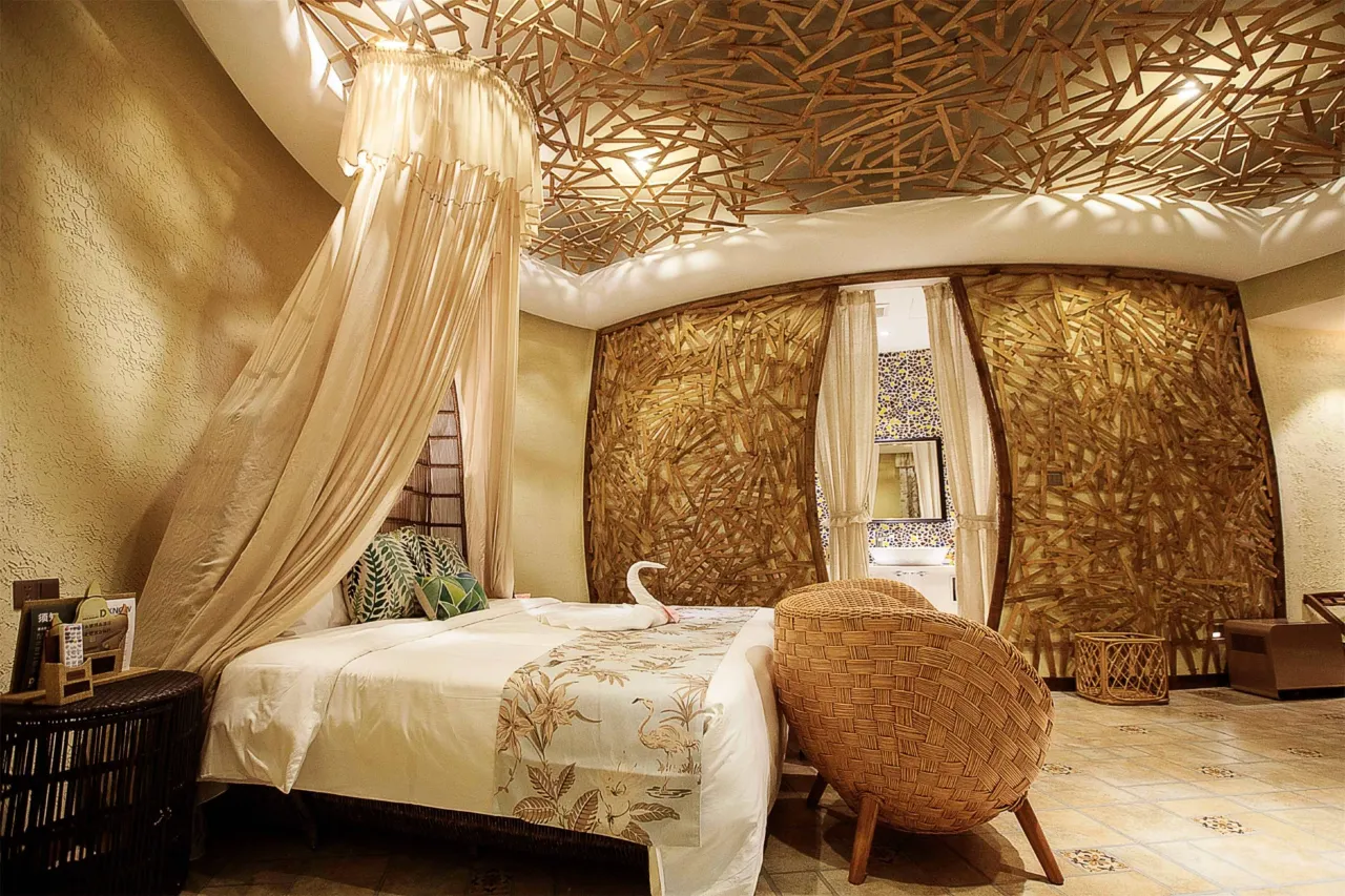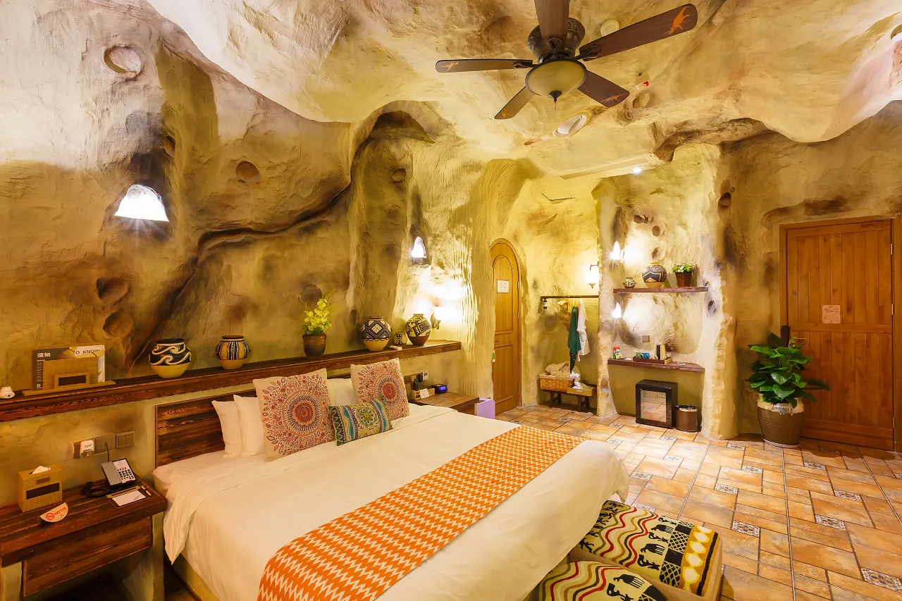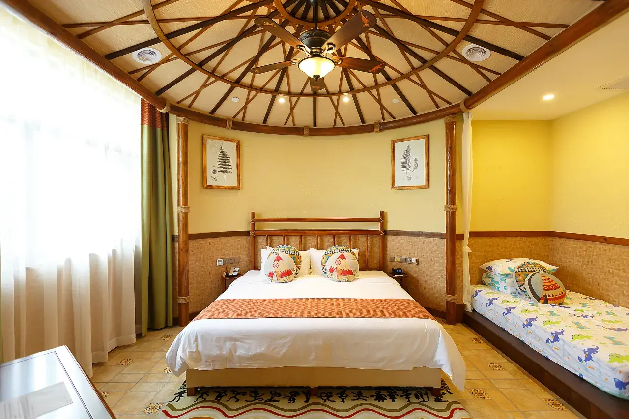 酒店拥有两百余间主题客房,包含7大主题、13种风格迥异的房型。本次套餐包含的房型是高端亲子房(宝贝家庭/考古帐篷家庭/翼龙巢/洞穴亲子4种房型随机安排)。