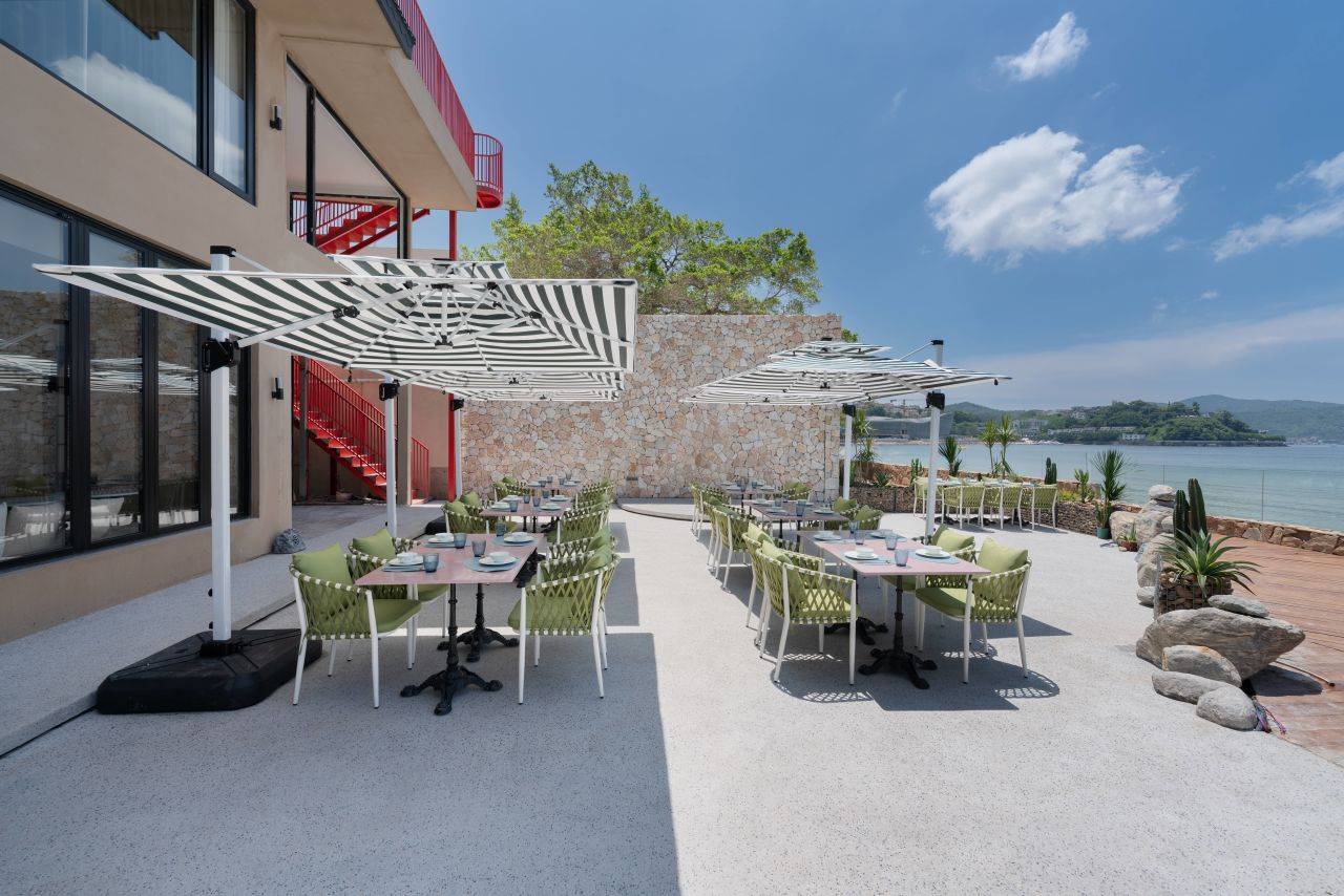 步入餐厅,一路绿植、藤编、原木的掩映,直至海边,豁然开朗。