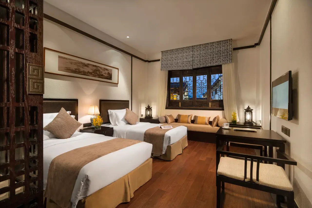 结合周边竹海、古街的环境,酒店设计依托传统江南民居,清雅古朴,167间新中式风客房,有着多元化房型,几乎每间推窗均可见绿意