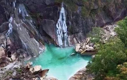 两旁翠竹横生,三级瀑布,